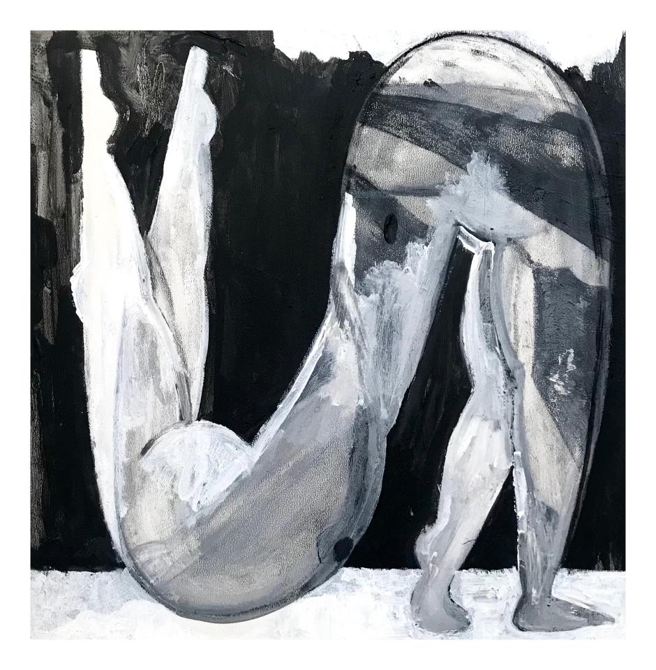 À la lisière entre la figuration et l’abstraction, elle peint des corps paysages qui ne se donnent pas à voir totalement. Elle représente des formes stylisées attestant d’un entre-deux : des fesses, des entrecuisses, des passages symbolisant des entrées dans l’espace de la peinture. Au moyen d’une palette de couleur réduite, elle fait du corps un motif aussi sculptural qu’architectural. Entre l’intimité́ et l’exhibition, l’artiste convoque chaque fois une pluralité́ de références qui génère autant d’expérimentations que de pistes de lecture.