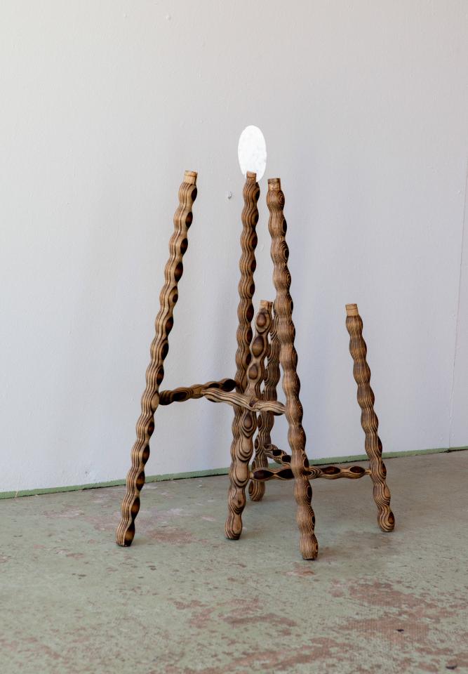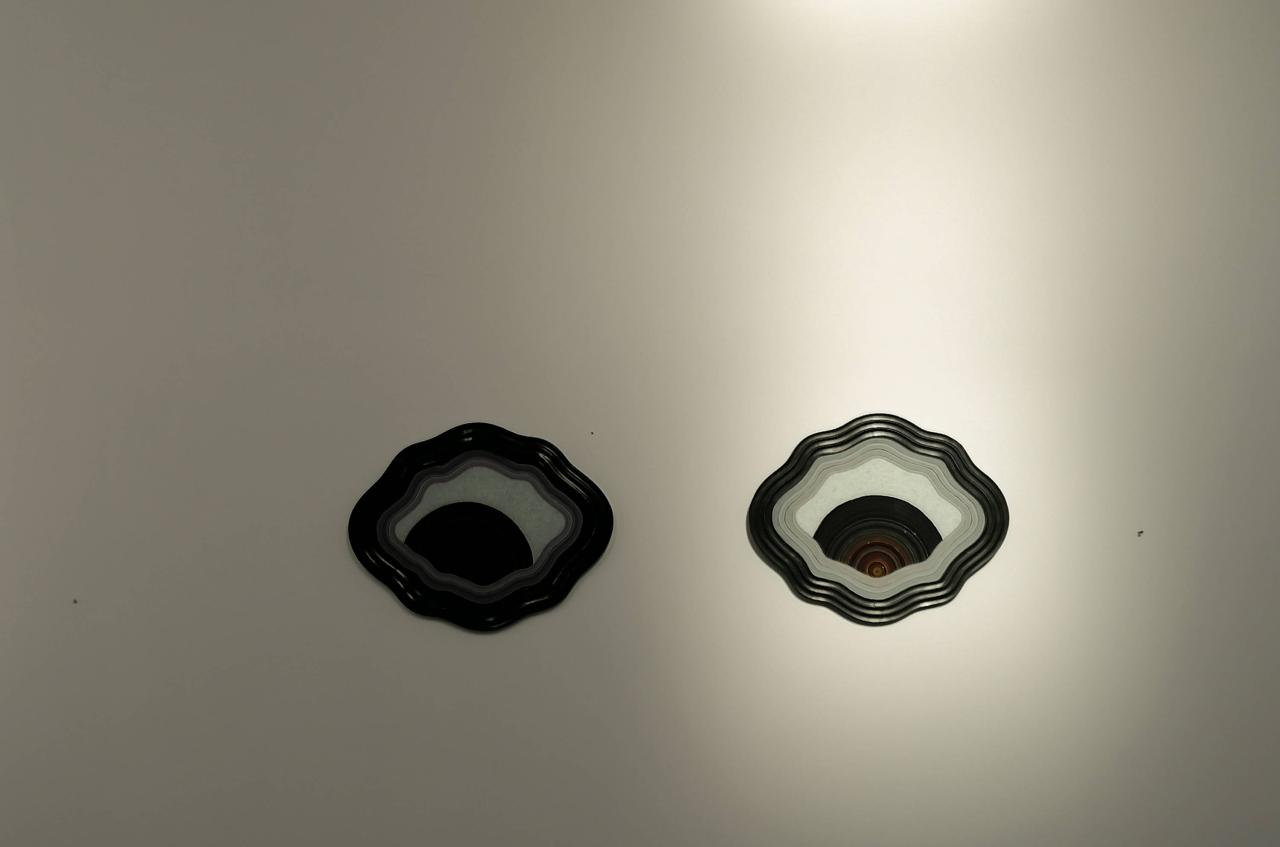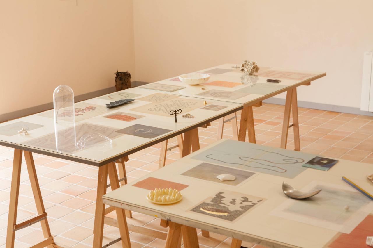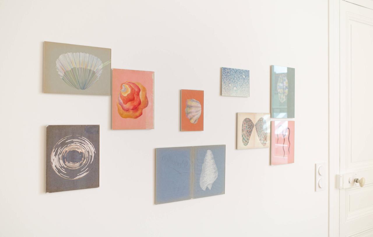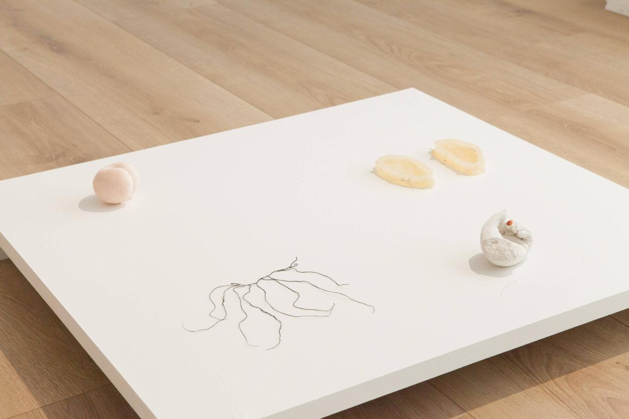 Minéraux ou organiques, vivants ou artificiels, les divers objets que je récupère sont des supports de réflexion. J’en accumule la plupart sans intention prédéfinie et je les dispose ensuite sur des étagères, dans mon atelier. Dans cette espèce de chambre des merveilles purement personnelle, des compositions se créent de manière perpetuelle et hasardeuse, selon l’introduction de nouvelles trouvailles. Ces collections font office de carnets de croquis dont j’essaie d’enregistrer les moindres détails : formes, matérialités, couleurs, évolution, métamorphoses, etc. Il ne s’agit pas de les représenter mais plutôt d’en produire des équivalents. Bruts ou travaillés, ces éléments accompagnent et initient ma pratique. Qu’ils subissent ou non un processus de détérioration ou de vieillissement, je dois les observer parfois longtemps avant de les intégrer à ma production. Le temps est ainsi une donnée fondamentale. Depuis le reflet fugace dans un miroir jusqu’à la lente déshydratation d’un fruit, mon travail conjugue action du temps et maîtrise des gestes. La géométrie devient molle, le support s’altère, la transparence est troublée. Si ma pratique ne se limite à aucun médium en particulier, le vocabulaire formel est restreint à son minimum. La ligne et la grille sont les outils graphiques essentiels à partir desquels sont explorées la couleur et la matière. Les bandes tracées au pinceau évoquent autant l’aspect de l’ananas que le châssis d’une fenêtre ou un lainage tricoté. Production et collection sont présentées ensemble, côte-à-côte. Toujours à la recherche d’un équilibre, d’un jeu d’associations universelles, leurs rencontres oscillent entre complémentarité et opposition.