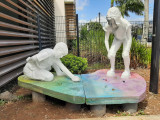 Stéphanie Hoareau considère que l’art peut créer un espace de guérison spirituelle. Ainsi, elle prend comme sujet des proches ou des paysages dont l’histoire croise la sienne. Pluridisciplinaire, son travail est souvent beau et dérangeant : comme Khaïs (2021), un buste hyperréaliste en plasticrète d’un môme en colère, ou encore Dessins de famille (2018), une série minutieuse composée de dessins, sur de petites tablettes en céramique, de saynètes familiales équivoques. Elle se penche souvent sur l’enfance, qu’elle considère comme une période aussi vulnérable que créative. Néanmoins, son travail porte aussi sur une histoire régionale où colonisation, migration et solipsisme constituent une forme d’identité. En témoignent ses deux premières œuvres majeures, Bélouve et Welcome Salazie (2010), des peintures modulaires portant sur le paysage montagnard de l’île de La Réunion, aussi graves et grouillantes l’une que l’autre, comme si la terre elle-même, objet de rêve pour certain·es, contenait des cauchemars transgénérationnels pour d’autres.