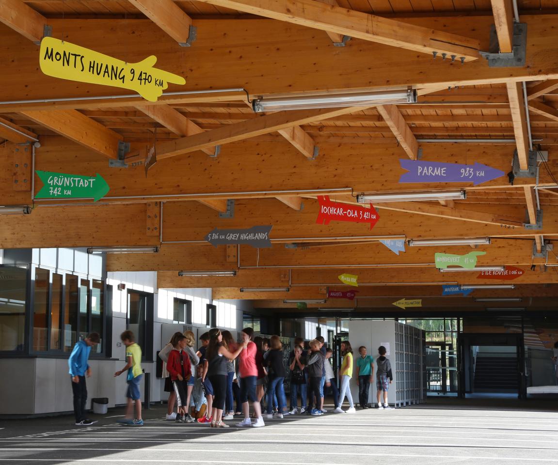 L’œuvre comprend 35 flèches indiquant les directions et les distances depuis le collège vers des destinations qui portent des noms de couleurs (préau), une série d'horloges qui indiquent l'heure locale dans 11 de ces destinations (hall), un lustre composé de 120 couleurs différentes, inspiré de la sphère des couleurs imaginée au XIXe siècle par Philipp Otto Runge (entrée).