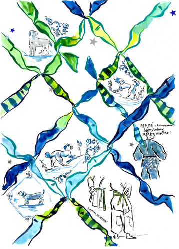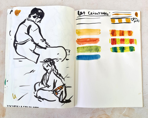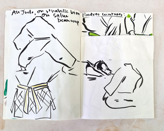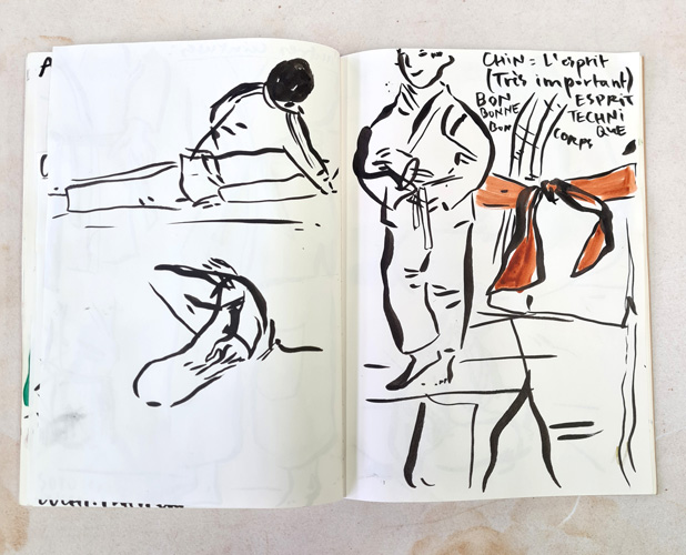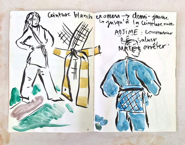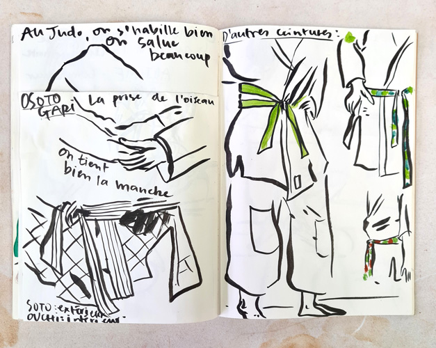 Lors des séances d'entrainement des judokas, Camille Chastang observe les mouvements et les gestes, ritualisés tels une danse. Les kimonos blancs sont ceints d'une ceinture, dont les couleurs indiquent les différents niveaux de compétition. L'ensemble constitue un répertoire de formes et de couleurs pour l'artiste qui les retranscrit dans son carnet.