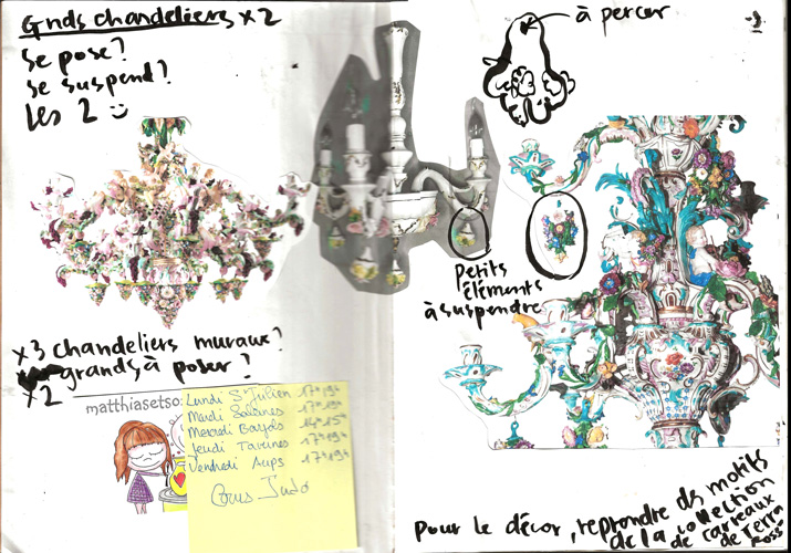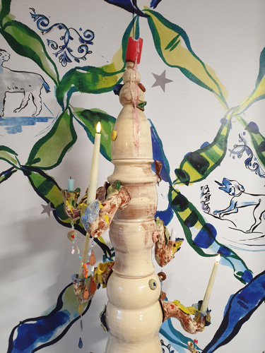 Inspirée par la flamme olympique et le rapport au feu de la céramique, Camille Chastang fait des recherches autour du bougeoir. Cet objet d'art décoratif lui inspire une nouvelle sculpture : un chandelier magistral de 1,60 mètre de hauteur.