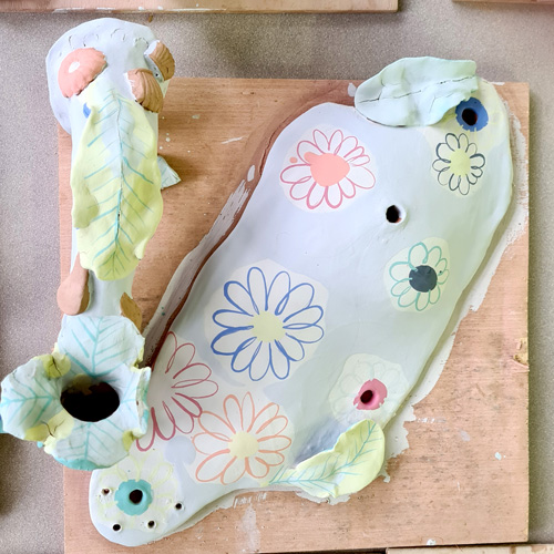 Enfin, l'emploi d'oxydes mélangés à une base d'engobe blanche est plus adapté pour obtenir les couleurs souhaitées par l'artiste, ravivées par une couverte transparente.