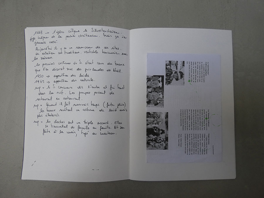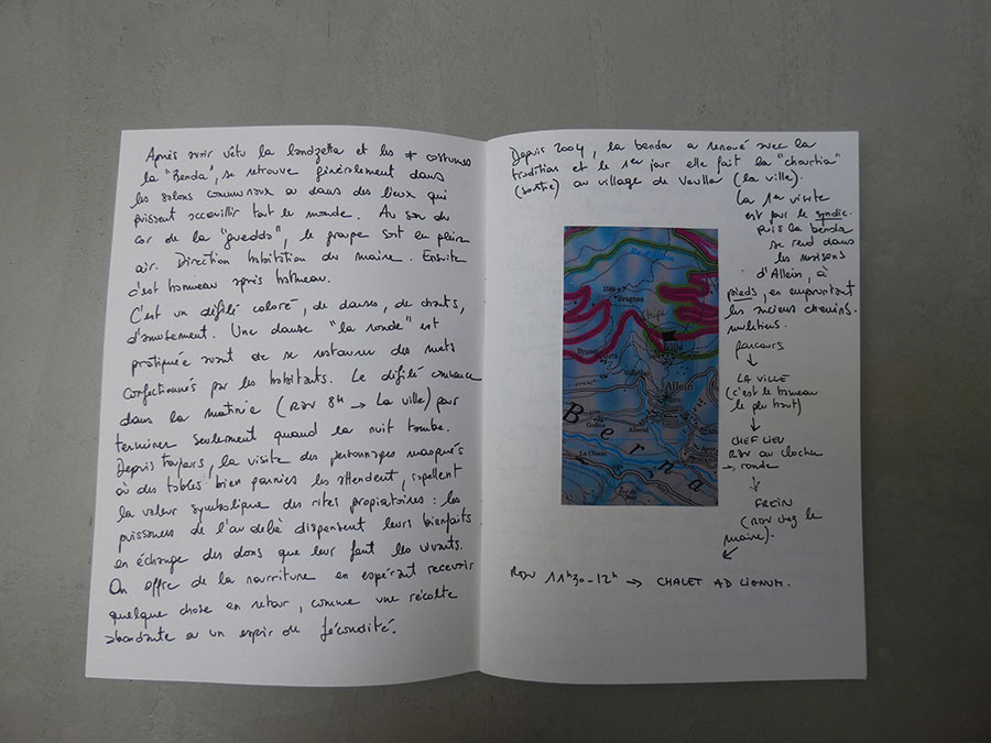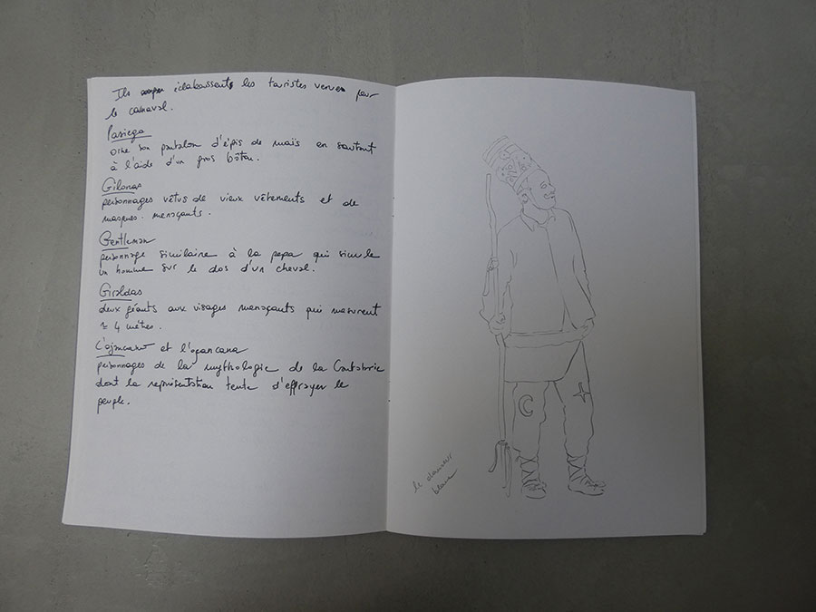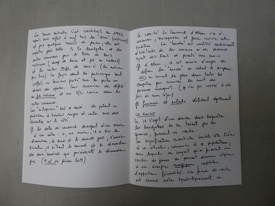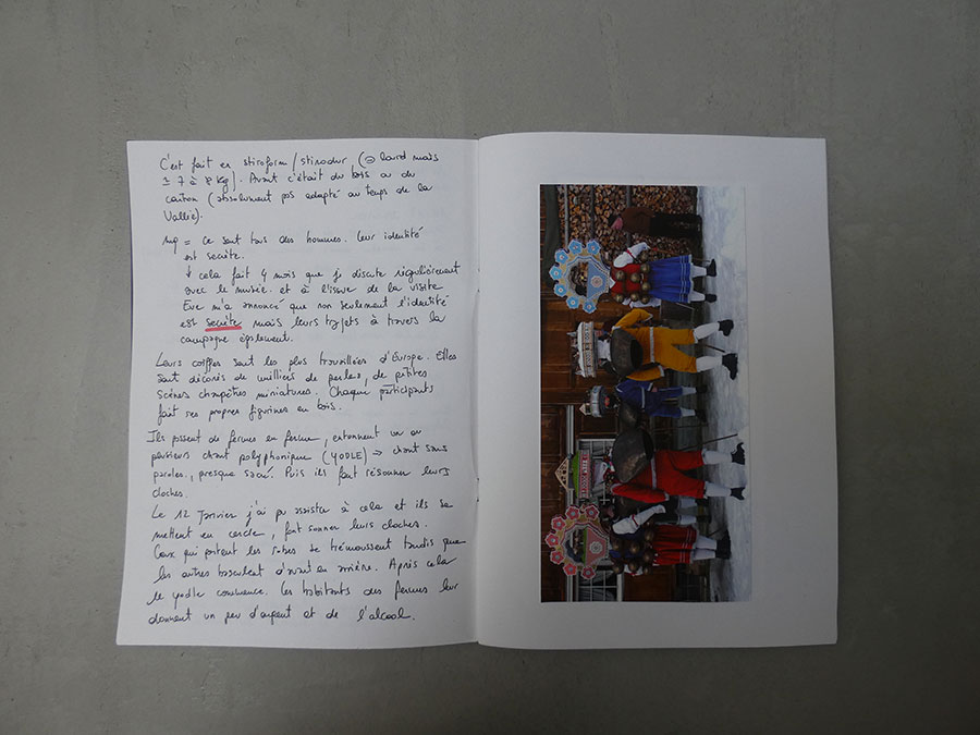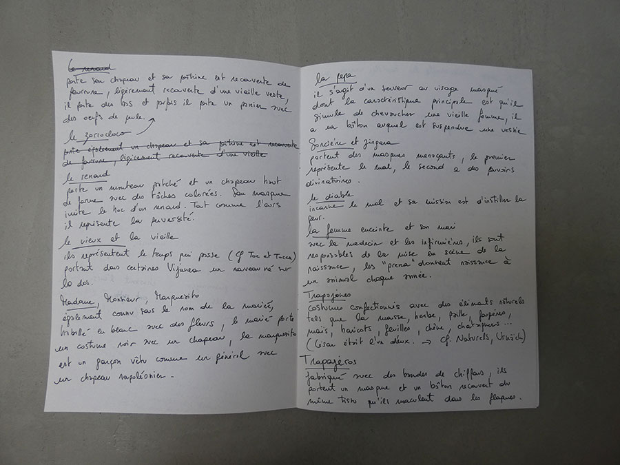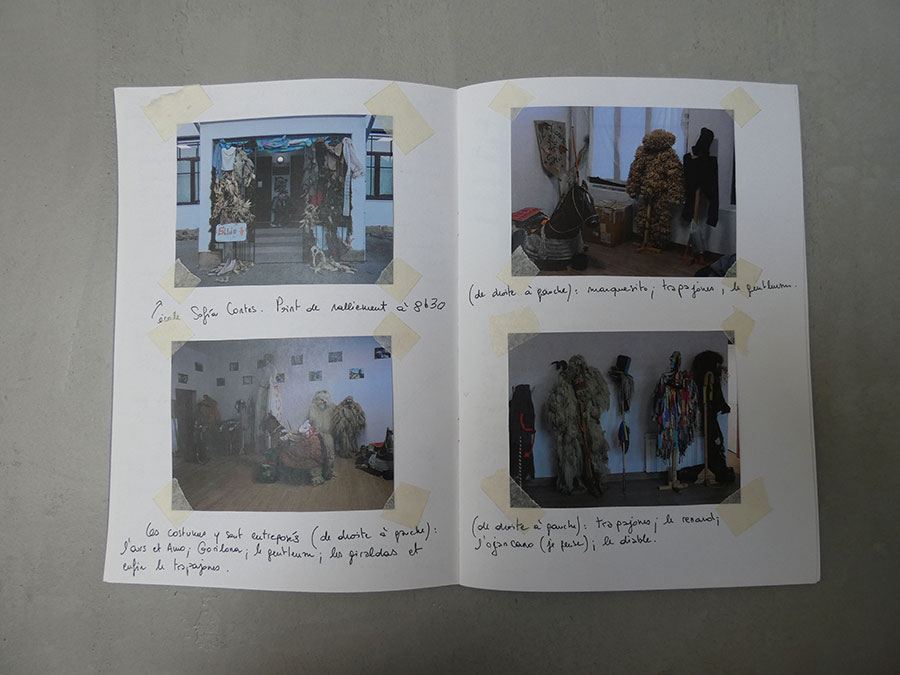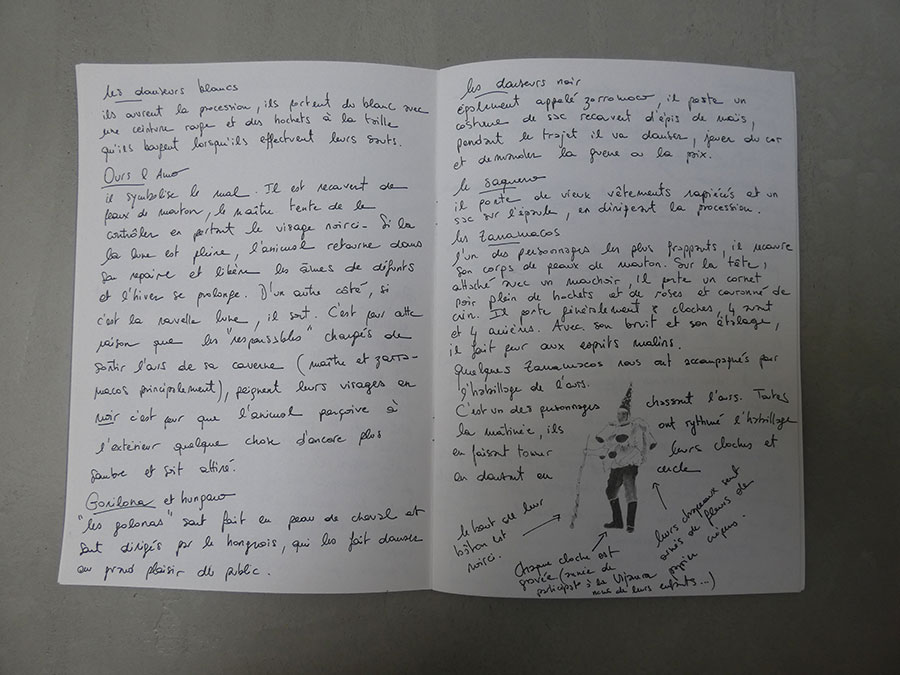 Il a été question d’archiver directement les données de l’invraisemblable mixage (costumes, masques, déroulé des rituels, carambolages temporels, etc), de rencontrer les diverses institutions culturelles, puis de collecter les témoignages des habitants acteurs ou spectateurs de ces rites en les accompagnant à travers les rues des villages en observateurs discrets.