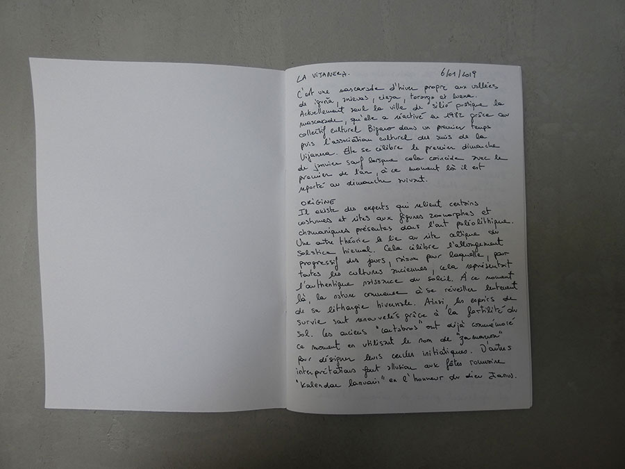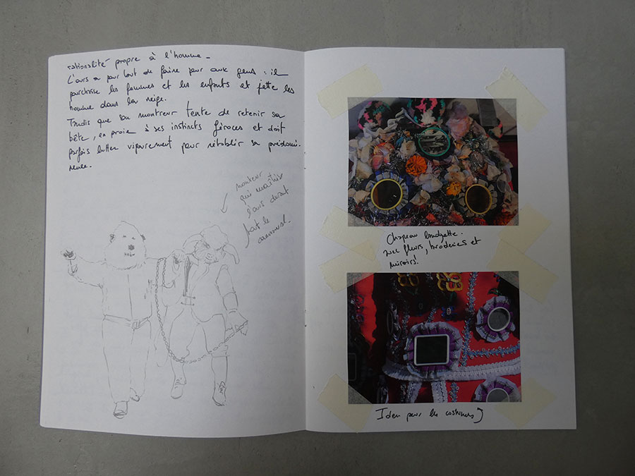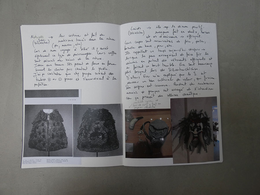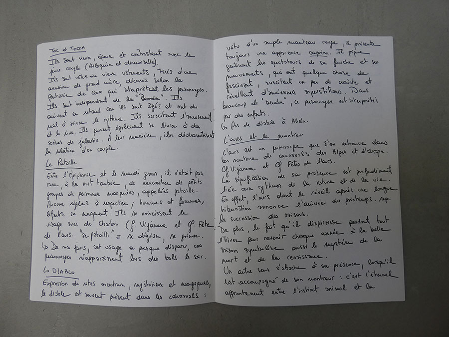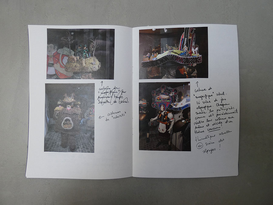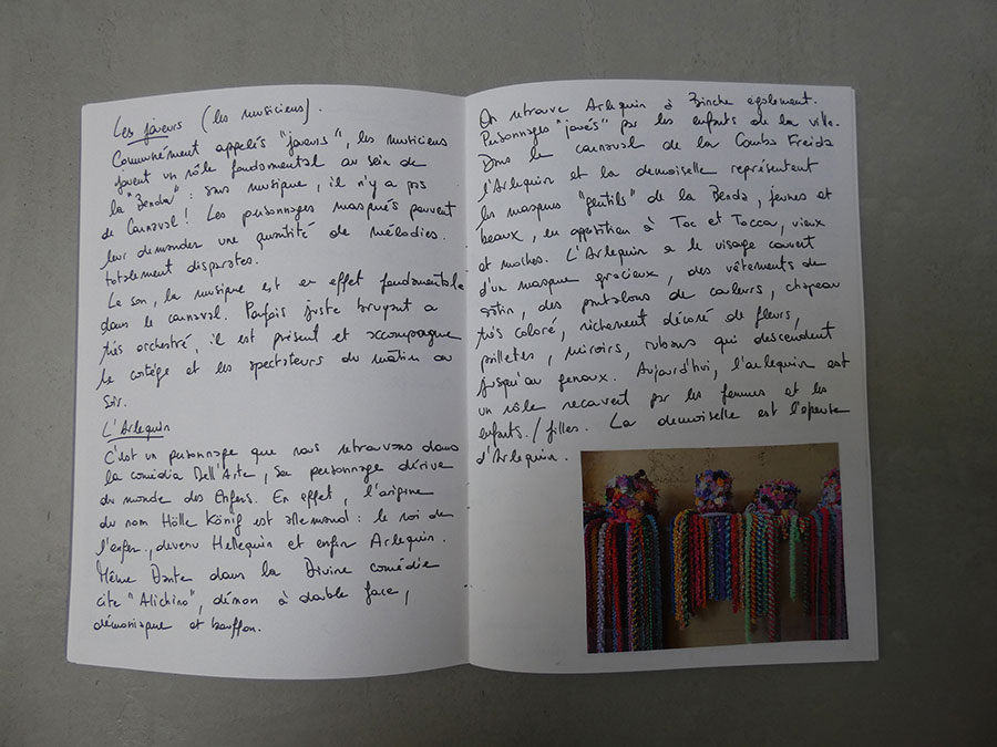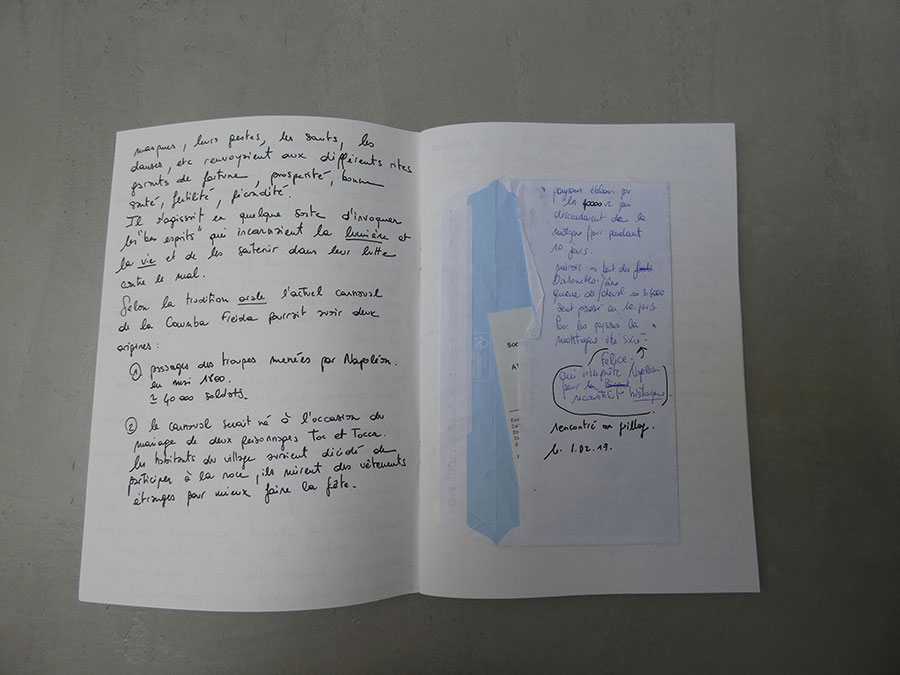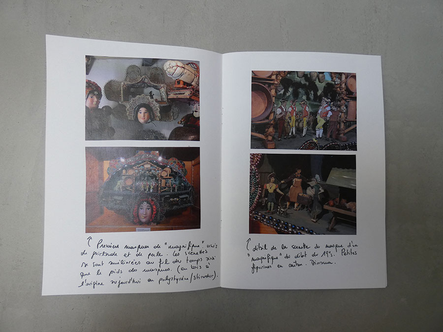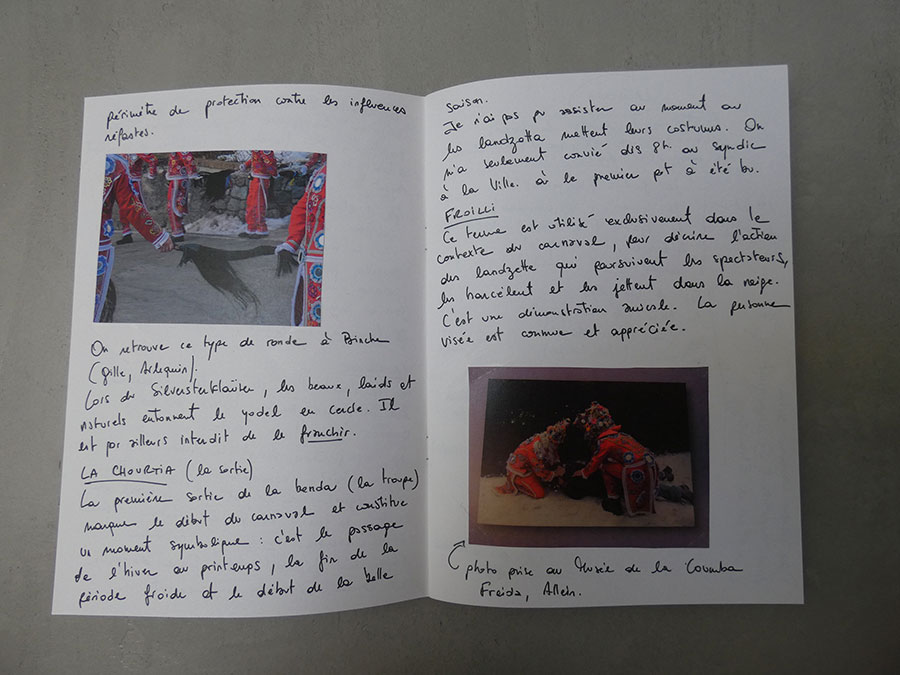Il a été question d’archiver directement les données de l’invraisemblable mixage (costumes, masques, déroulé des rituels, carambolages temporels, etc), de rencontrer les diverses institutions culturelles, puis de collecter les témoignages des habitants acteurs ou spectateurs de ces rites en les accompagnant à travers les rues des villages en observateurs discrets.