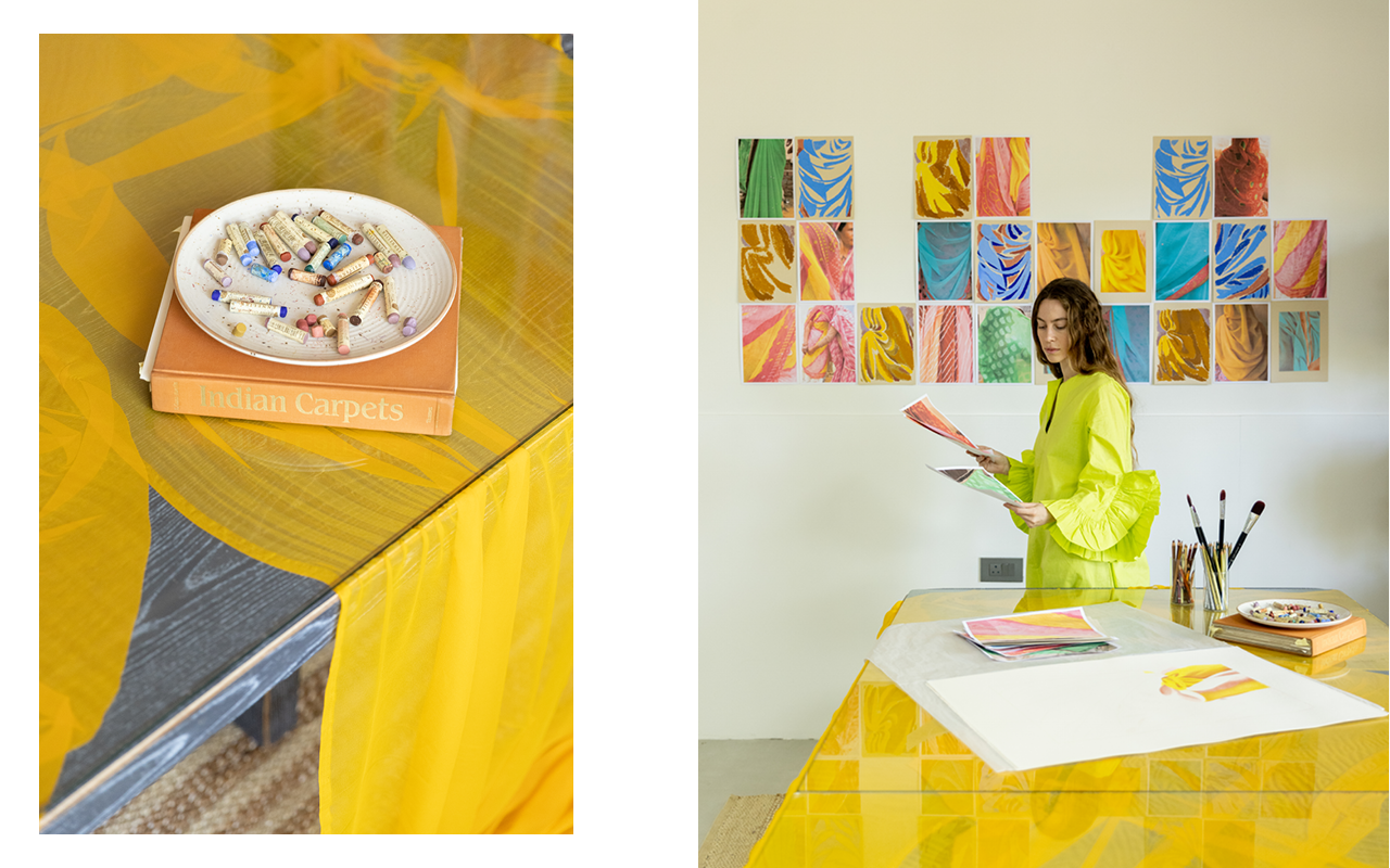 — Elvira Voynarovska : Ça faisait plusieurs années que je voulais travailler sur le support du textile. Je cherchais un moyen d’appliquer certains de mes dessins sur de la tapisserie faite à la main. En Inde, ce savoir-faire existe toujours, avec une vraie tradition de travail manuel.