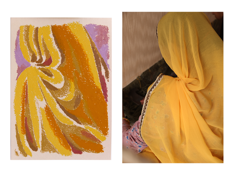 — Elvira Voynarovska : En fait, ce qui était le plus pratique, c’était vraiment de commencer par un travail photographique. Ce qui m’intéressait, c’était de jouer entre une représentation à la fois figurative et abstraite, de me placer entre les deux. Le passage par la photo introduit déjà une forme d’abstraction, rien que par le cadrage que je choisis, souvent très serré. Ensuite, je revenais dessus avec une relecture au pastel, donc beaucoup plus graphique. Je n’avais pas forcément envie de représenter les femmes artisanes exactement telles qu’elles sont. Et en même temps, je ne pense pas que ce travail de dessin soit totalement abstrait, parce qu’on voit bien, à travers les graphismes que j’ai développés, qu’il est question de tissu, de textile, de trames… Il y a des éléments visuels qui évoquent clairement cet univers-là. C’est quelque chose qui revient souvent dans mon travail : cette construction par étapes. C’est assez intuitif. Au départ, je n’avais même pas en tête de faire des œuvres murales ou des tapisseries. Je pensais à un paravent, donc à un objet de mobilier, rien à voir. Et en dessinant, peu à peu, je me suis dit que ce serait très beau de faire une série de tapisseries où on représente ces femmes ; Cela faisait vraiment sens pour moi.