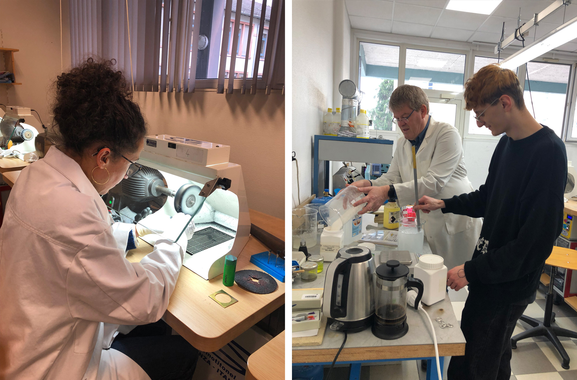 — Gaëlle Foray : J’avais apporté trois sortes de pierres sans savoir ce qu’il allait être possible de faire : des calcédoines, des calcites et des rostres de bélemnite fossilisés. Plusieurs élèves se sont très vite emparé·es de cette question technique et ont fait tous les essais possibles et imaginables pour adapter leurs machines et savoir-faire à mes pierres. Ces tentatives étaient assez jubilatoires, je les voyais passer mes pierres dans des bains, dans des machines à ultrasons, sous des dremels et des tours à polir. Ils et elles sont formé·es pour polir du métal 8h par jour dans des usines de bijoux, de montres ou de casseroles. Ils et elles ne doivent pas particulièrement faire preuve de créativité mais principalement polir parfaitement. Leur patience dès le CAP m’a beaucoup impressionnée.