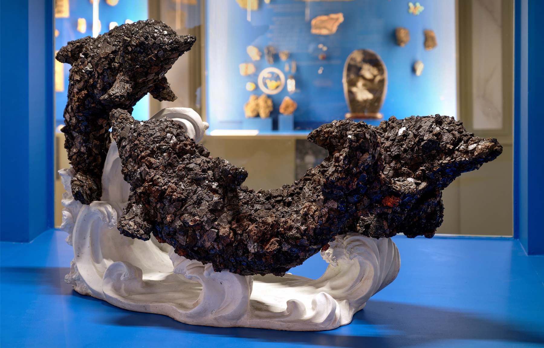 Laminage, photographie sur dos bleu, 175 x 110 cm, 2023 et Le monde d’après, installation (béton, verre, tupperwares, pyrite, pierre), 2024