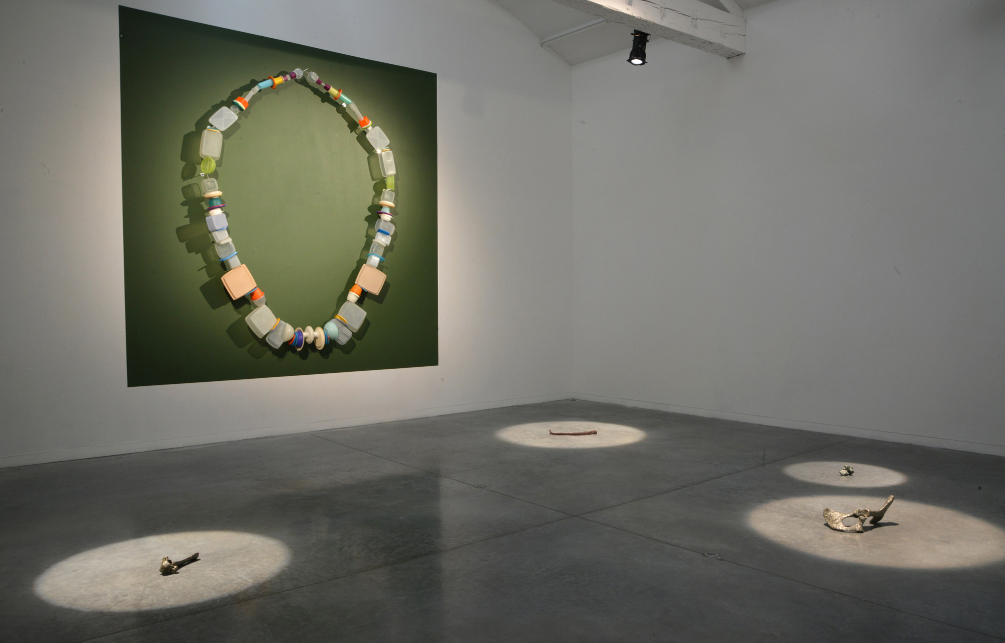 Dans notre sélection 2024 de trois artistes, nous avons donc retenu Gaëlle Foray pour plusieurs raisons. D’abord, j’avais eu la chance de collaborer avec elle dans le cadre de l’ancien dispositif "Veduta" de la Biennale de Lyon. Le contexte dans lequel nous avions travaillé - un établissement de santé pour adolescent·es basé à Chanay (Ain) - était particulièrement passionnant et dans le même temps très complexe. Je connaissais ainsi les capacités de flexibilité de Gaëlle et sa résilience à des milieux, comme dirait Foucault, "coercitifs" (l’école, l’hôpital, l’usine, la prison, etc.). Par ailleurs, Montbéliard est une petite commune, entourée par des territoires ruraux et de montagnes. Un contexte géographique particulier donc, que Gaëlle connaît bien - qualifié d’ailleurs de "périurbain" dans un article de Philippe Dagen à son sujet - et qui me semblait propice à la poursuite de sa pratique en général, basée sur des processus d’investigations et reposant sur des principes de collecte ou de trouvaille. Je me souvenais enfin d’un grand collier composé de boîtes tupperwares qu’elle avait présenté au Centre d’art de Lacoux. Je me suis dit qu’elle serait peut-être amusée de reprendre cette exploration de la forme bijou et elle nous a répondu avec enthousiasme à propos des fossiles qu’elle récupérait alors dans la montagne.