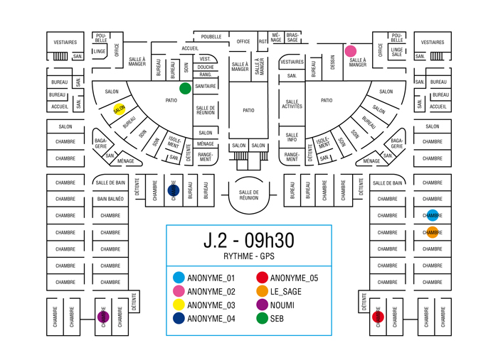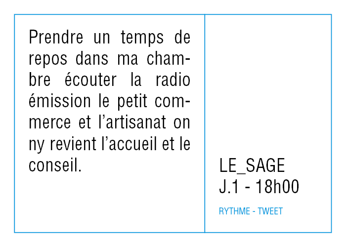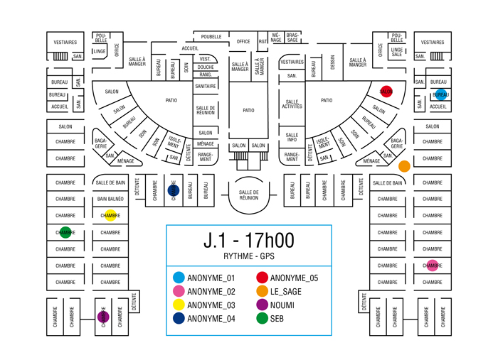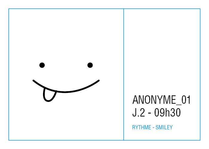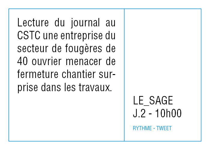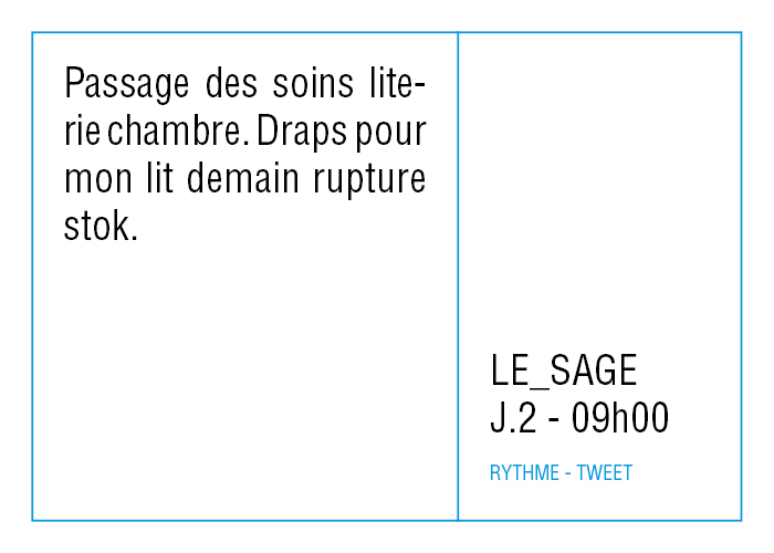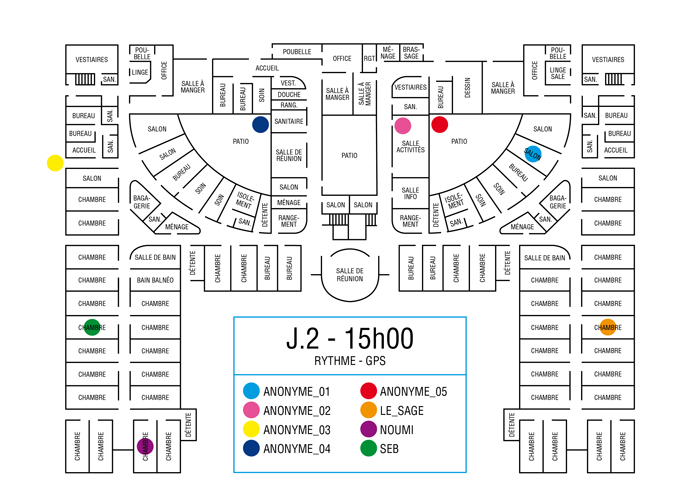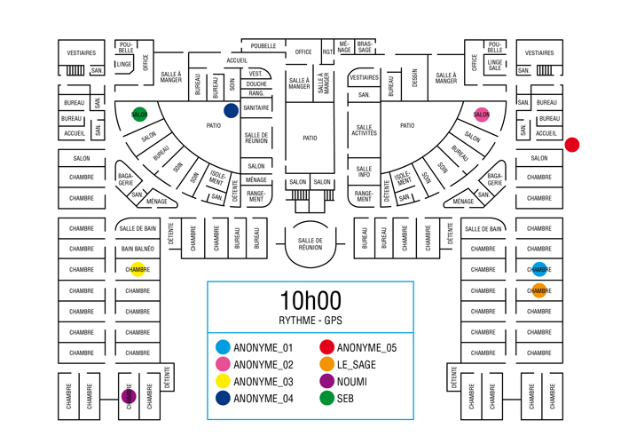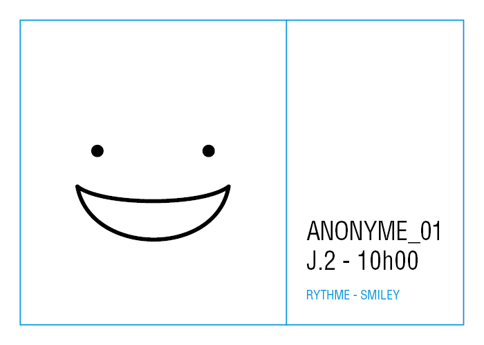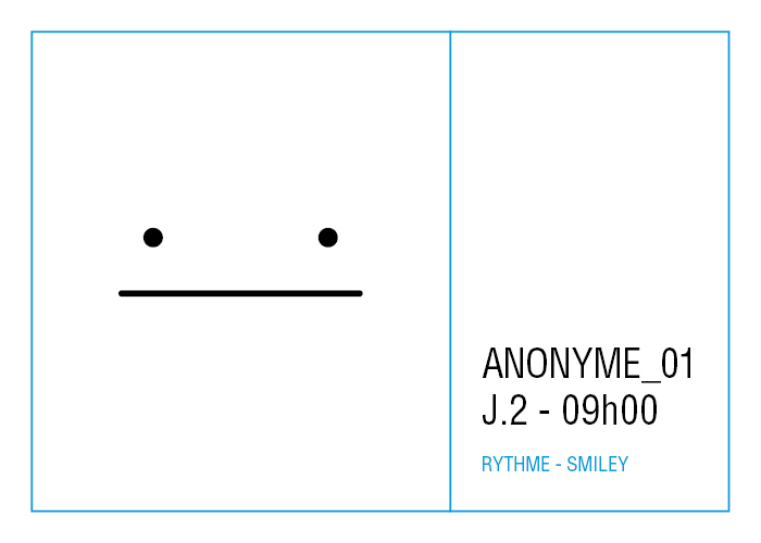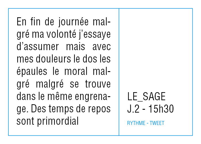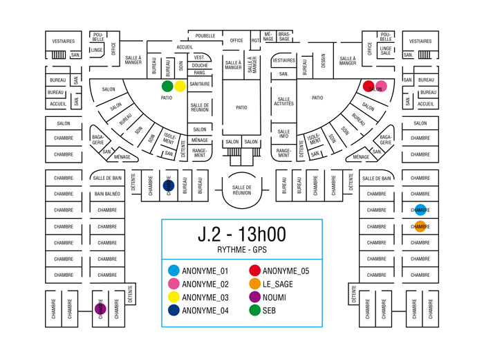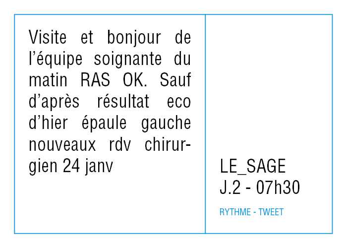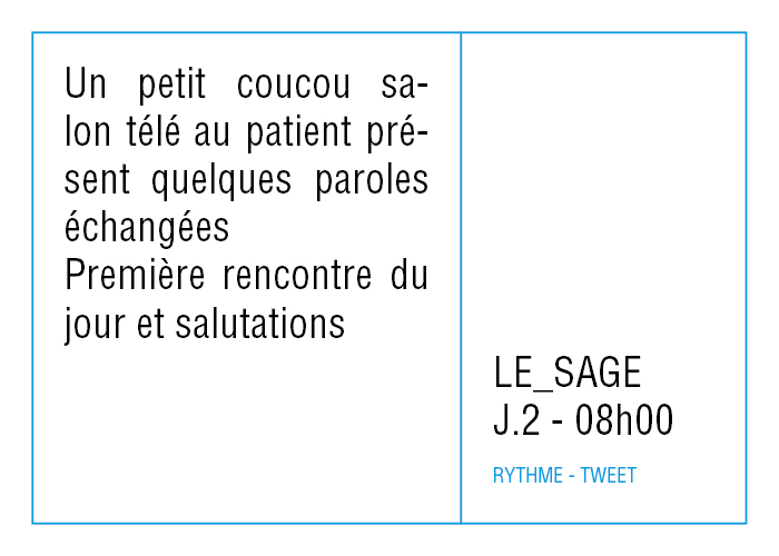 L’artiste présente pendant la résidence l’installation Rythme - journal de bord (du 2 avril au 14 juin 2015 dans la salle d’attente du pôle G04 du CHGR), puis il réalise l’édition Rythme qui condense l’ensemble des données récoltés sous la forme d’une édition déployable en installation.