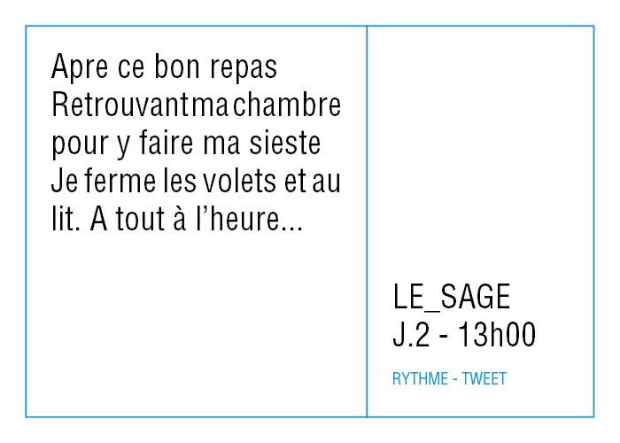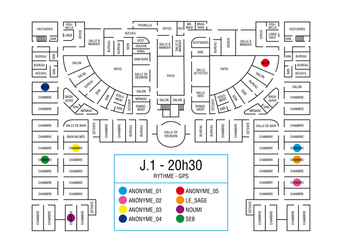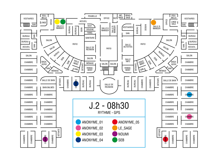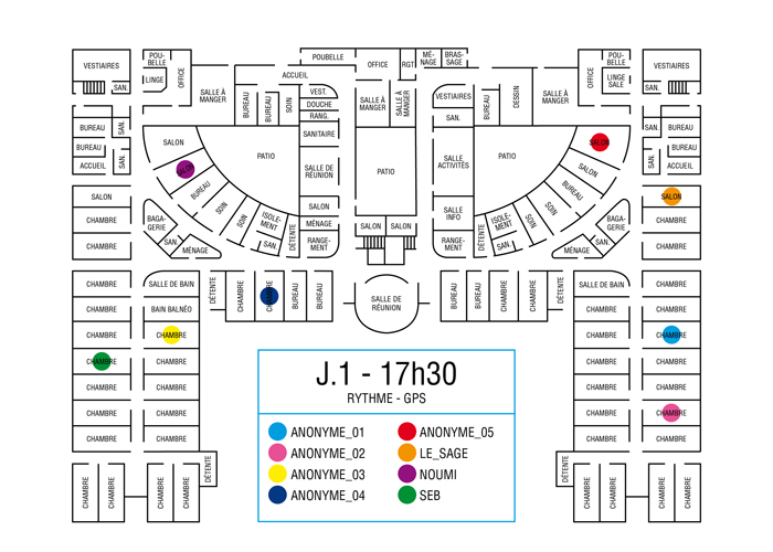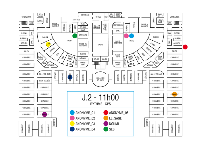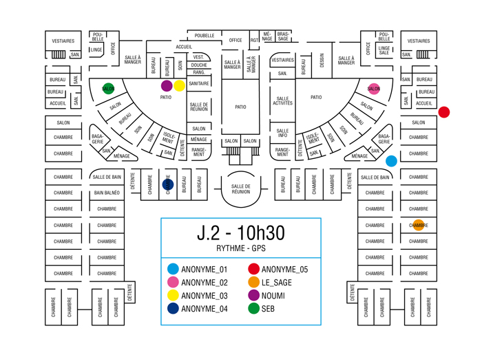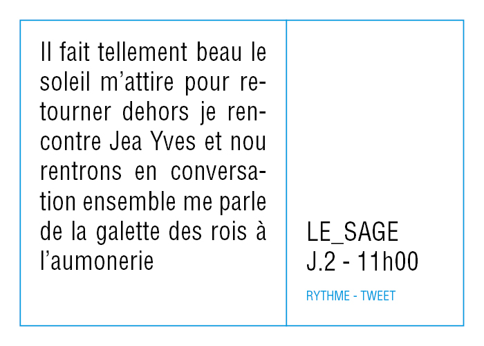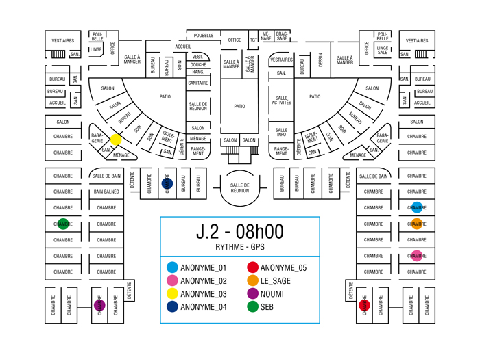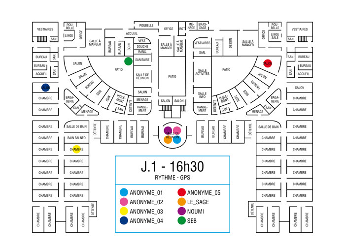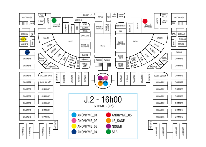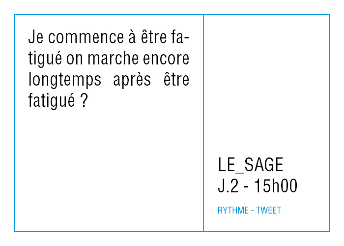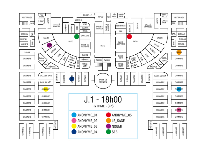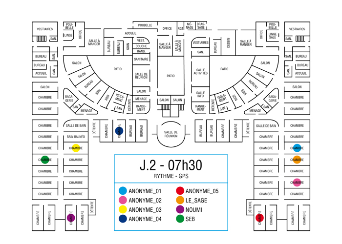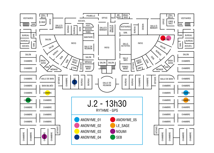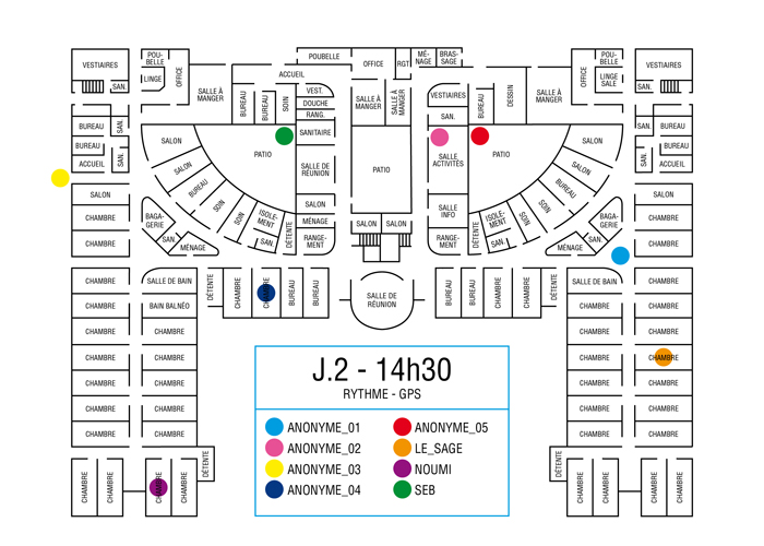 L’artiste présente pendant la résidence l’installation Rythme - journal de bord (du 2 avril au 14 juin 2015 dans la salle d’attente du pôle G04 du CHGR), puis il réalise l’édition Rythme qui condense l’ensemble des données récoltés sous la forme d’une édition déployable en installation.