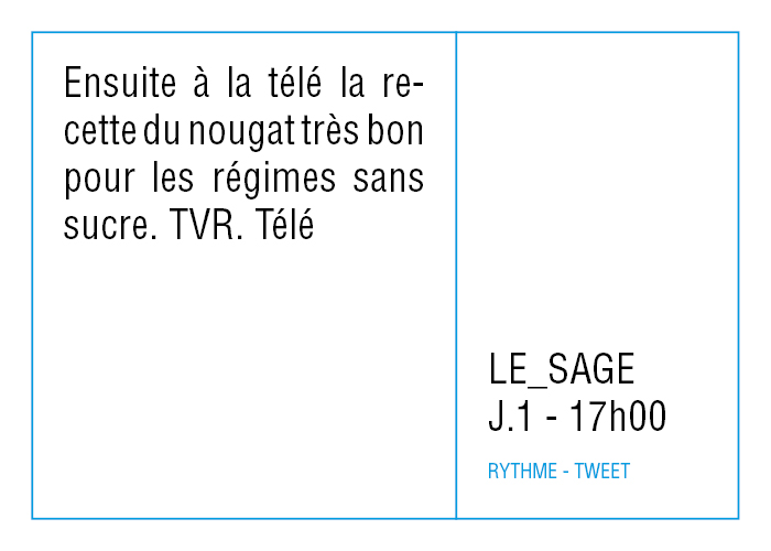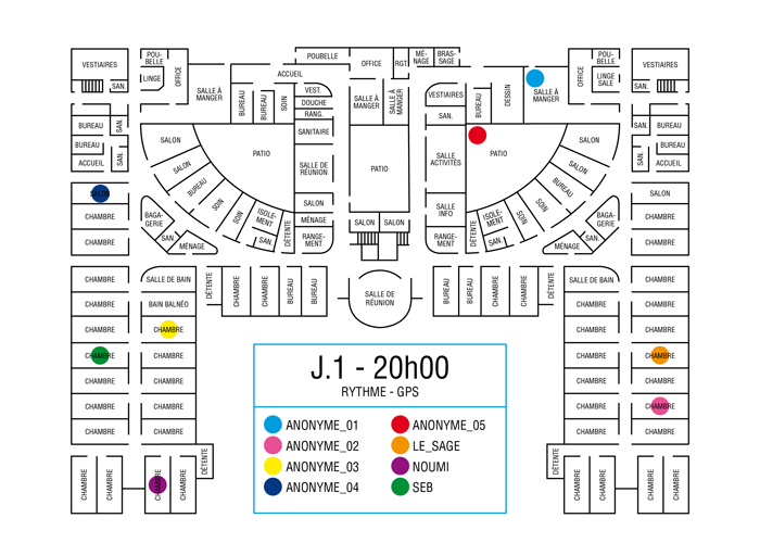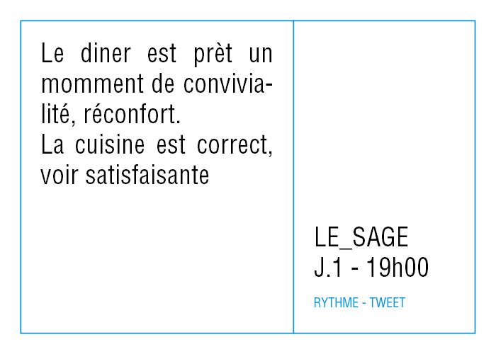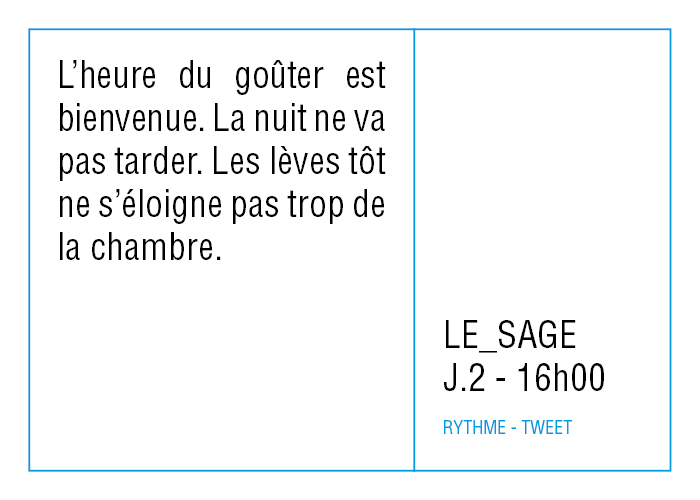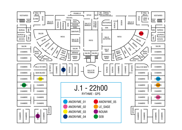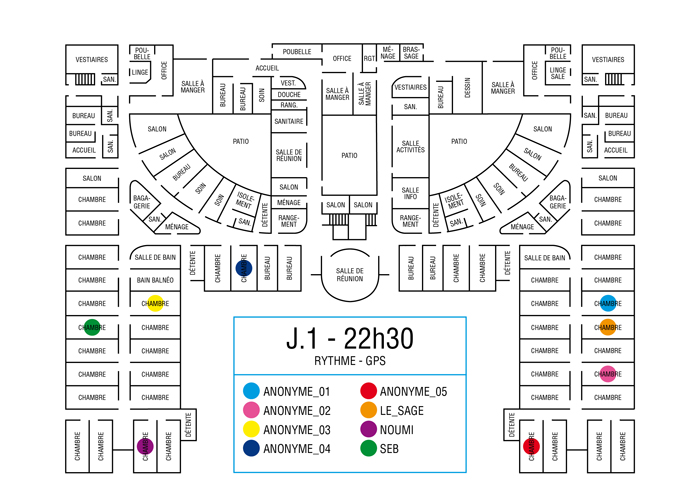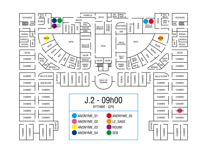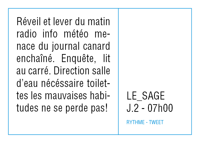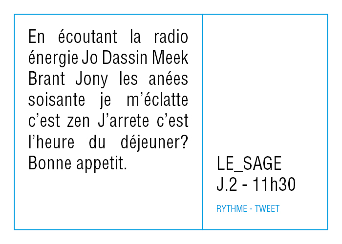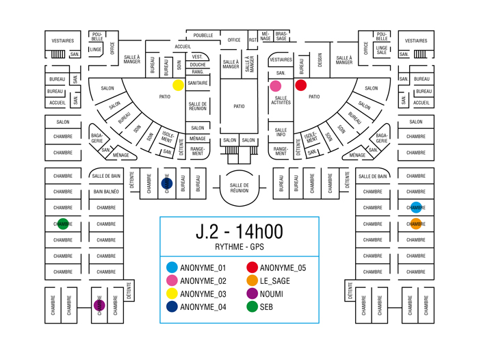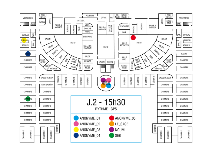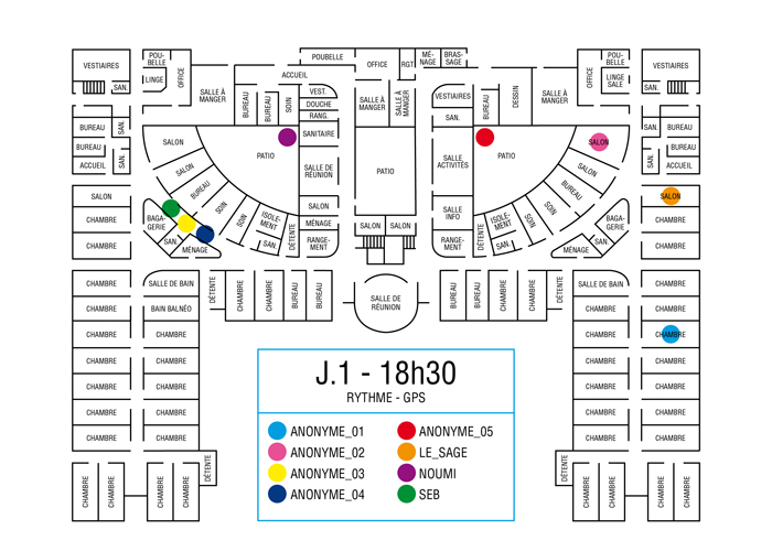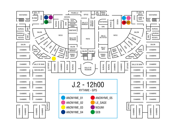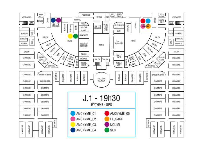 L’artiste présente pendant la résidence l’installation Rythme - journal de bord (du 2 avril au 14 juin 2015 dans la salle d’attente du pôle G04 du CHGR), puis il réalise l’édition Rythme qui condense l’ensemble des données récoltés sous la forme d’une édition déployable en installation.