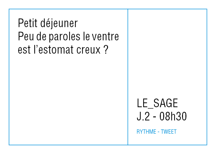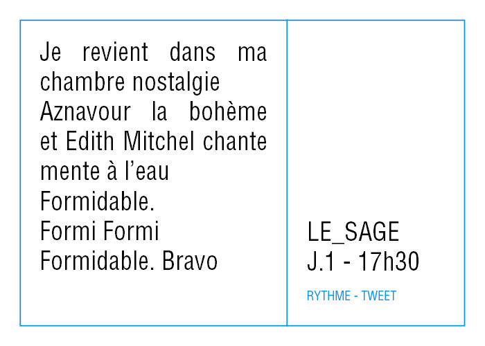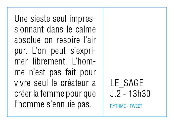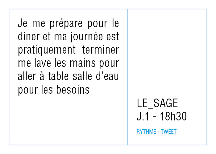 Le réseau social low-tech mis en oeuvre pour la résidence a été pensé initialement pour répondre à l’impératif de créer des formes courtes - on peut noter ici le paradoxe de décrire avec des simulacres d'outils hyperactifs un rythme de vie qui ne l'est pas - ce n'est qu'une fois toutes les données récoltées que j'ai vraiment eu la sensation d'avoir créé une sorte de Big Data.
