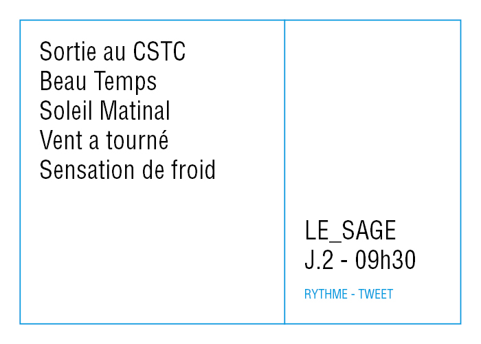 La période à décrire est courte, la prise de note doit l’être aussi. Nous empruntons donc aux formes brèves utilisées aujourd’hui dans les nouvelles technologies et dans le micro-blogging. Ainsi la note est réduite et les outils diversifiés. 5 journées sont décrites, une par outil :