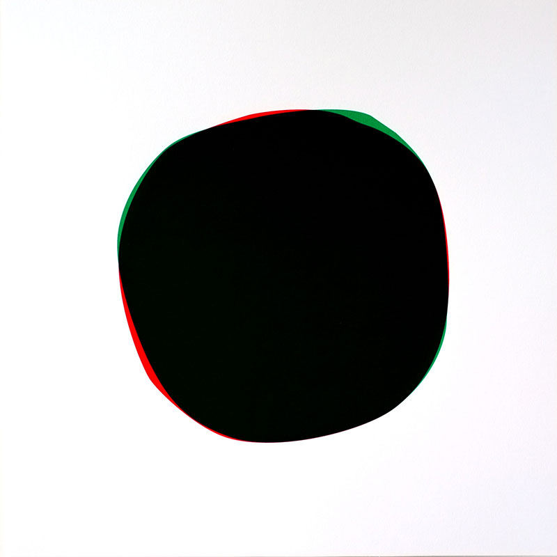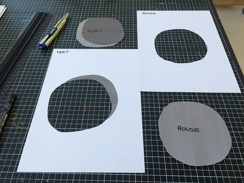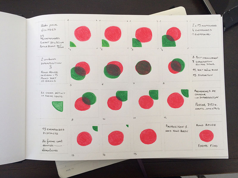 Abandonner toute forme que l’on connait déjà, tout mot pour la définir, et aller au plus simple, qui peut être radical. Car si la commande n’est pas un exercice facile, il s’agit parfois d’intégrer la contrainte pour lui ôter son caractère impersonnel. Une éclipse, oui. Mais qu’importe le nom, de lune ou de soleil, la forme préexiste au langage. Et d’ÉCLIPSES au pluriel, on passe à l’ÉCLIPSE, singulière bicolore.