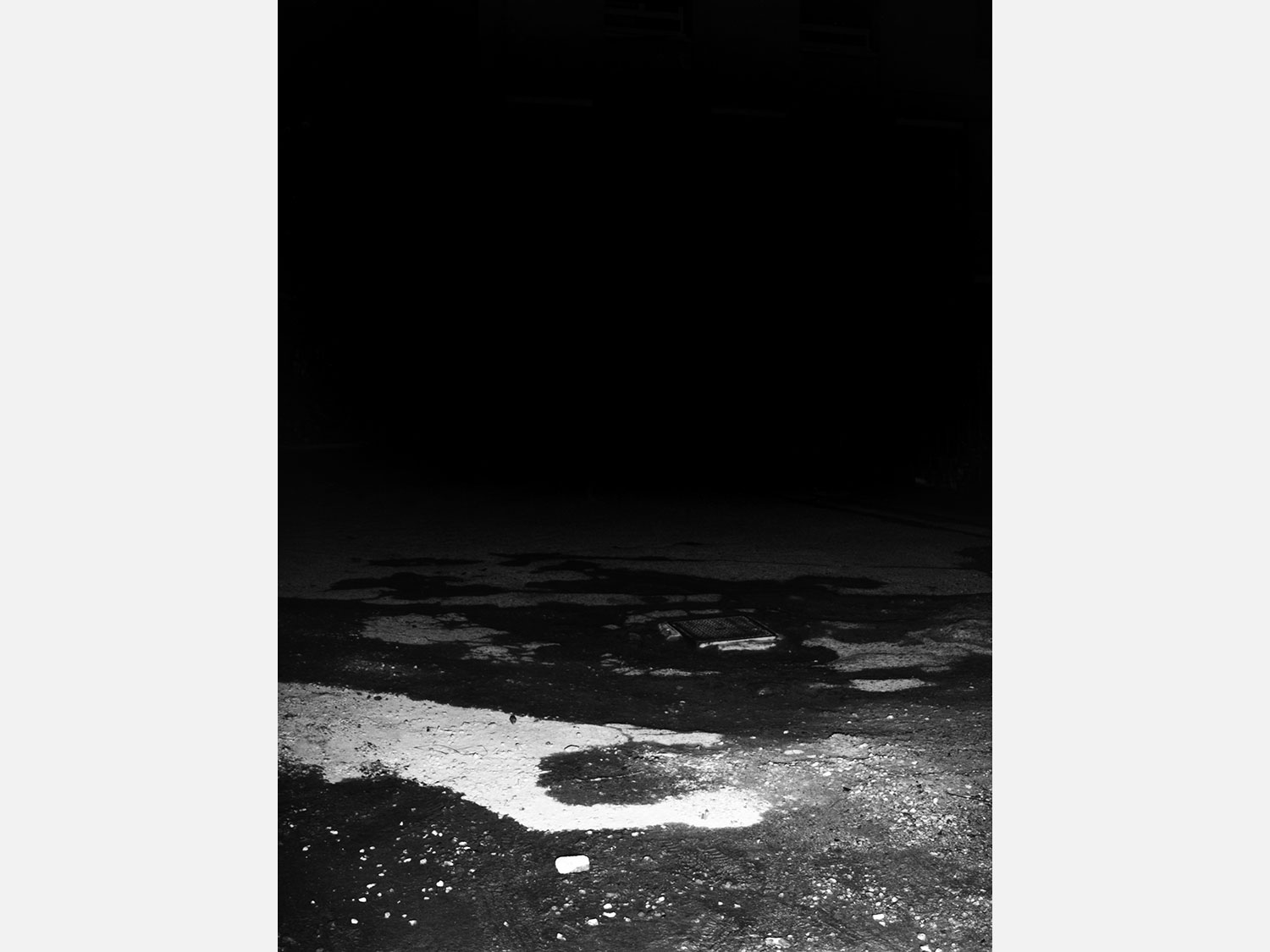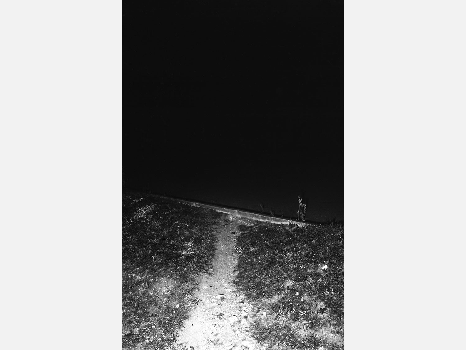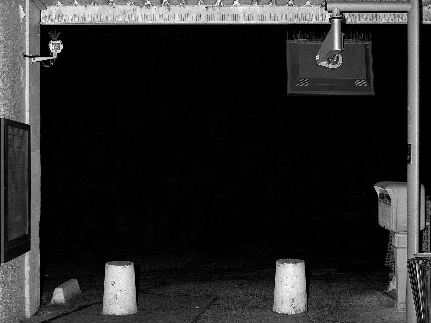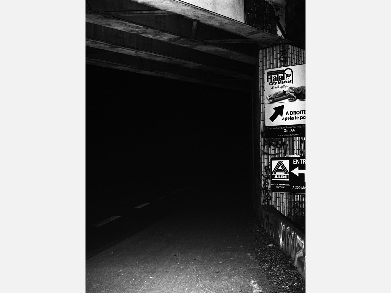 Le projet de Karim Kal suit la ligne D du RER, de Grigny à Corbeil. Les photographies, prises de nuit au flash à courte portée, sont à la fois inquiétantes et familières. Car, au-delà de l’étrangeté de l’image qui se présente, nous connaissons intimement ces formes et ces matériaux, ces passages, ces abris, ces raccourcis qui mènent plus vite à la sortie ou au prochain train. Dans le contraste cru du noir et blanc apparaît également la tension entre l’espace collectif et l’espace privé, entre la planification et l’utilisation, entre l’autorité et la transgression.