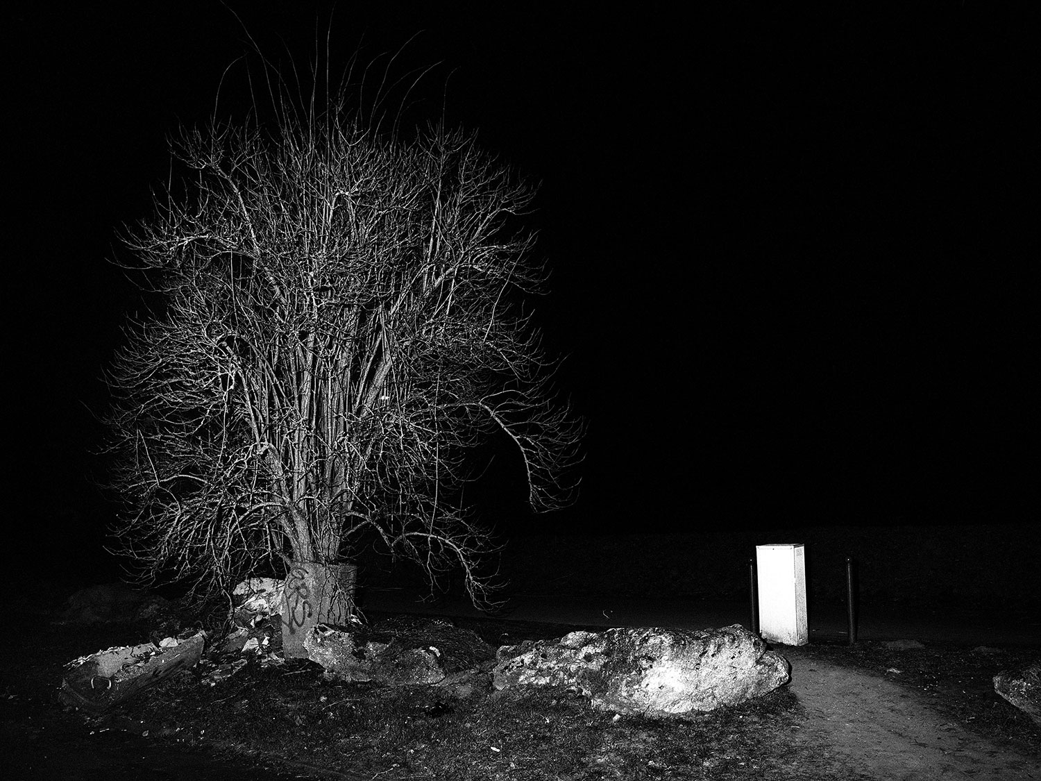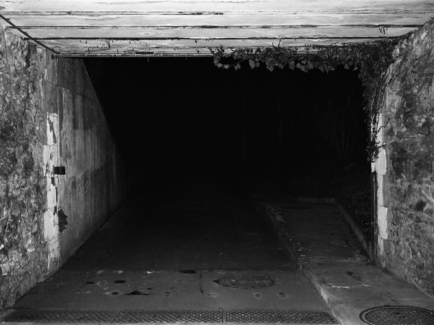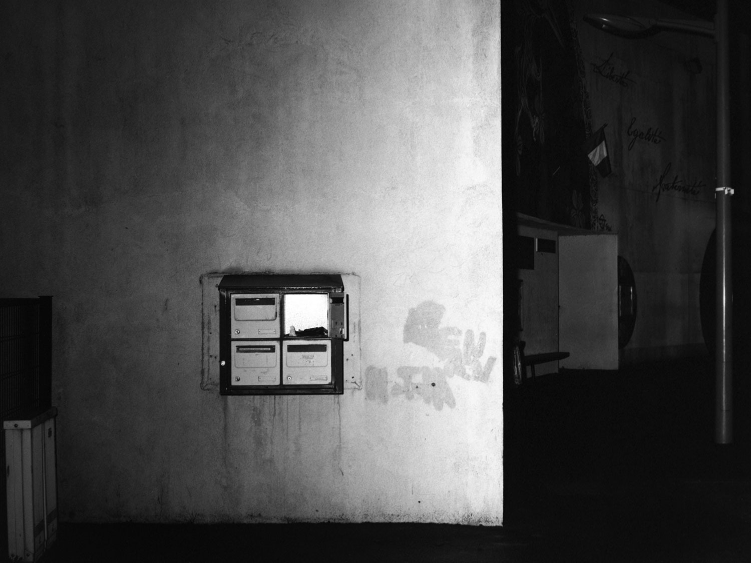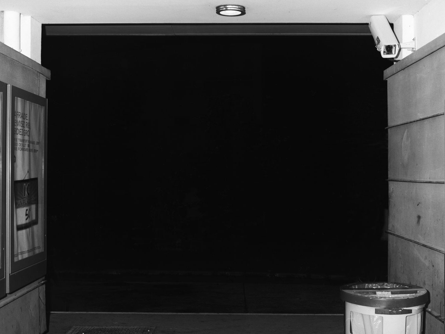 Le projet de Karim Kal suit la ligne D du RER, de Grigny à Corbeil. Les photographies, prises de nuit au flash à courte portée, sont à la fois inquiétantes et familières. Car, au-delà de l’étrangeté de l’image qui se présente, nous connaissons intimement ces formes et ces matériaux, ces passages, ces abris, ces raccourcis qui mènent plus vite à la sortie ou au prochain train. Dans le contraste cru du noir et blanc apparaît également la tension entre l’espace collectif et l’espace privé, entre la planification et l’utilisation, entre l’autorité et la transgression.