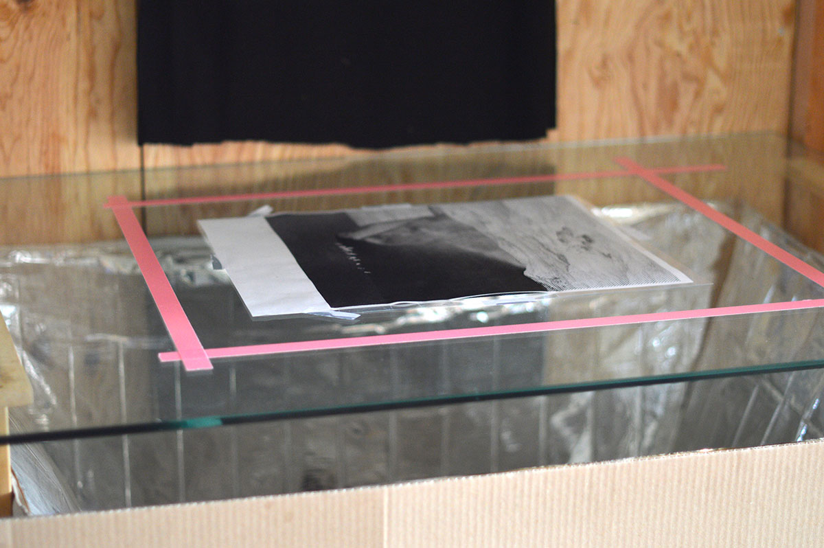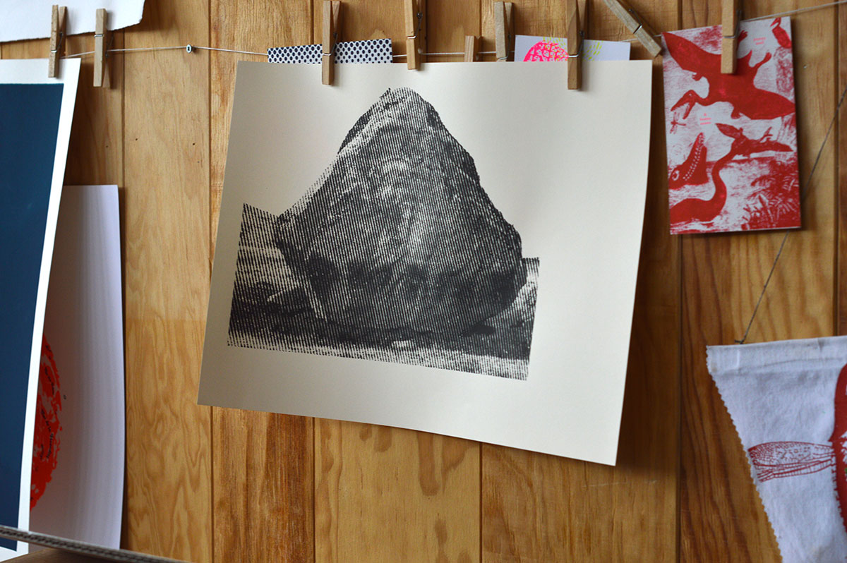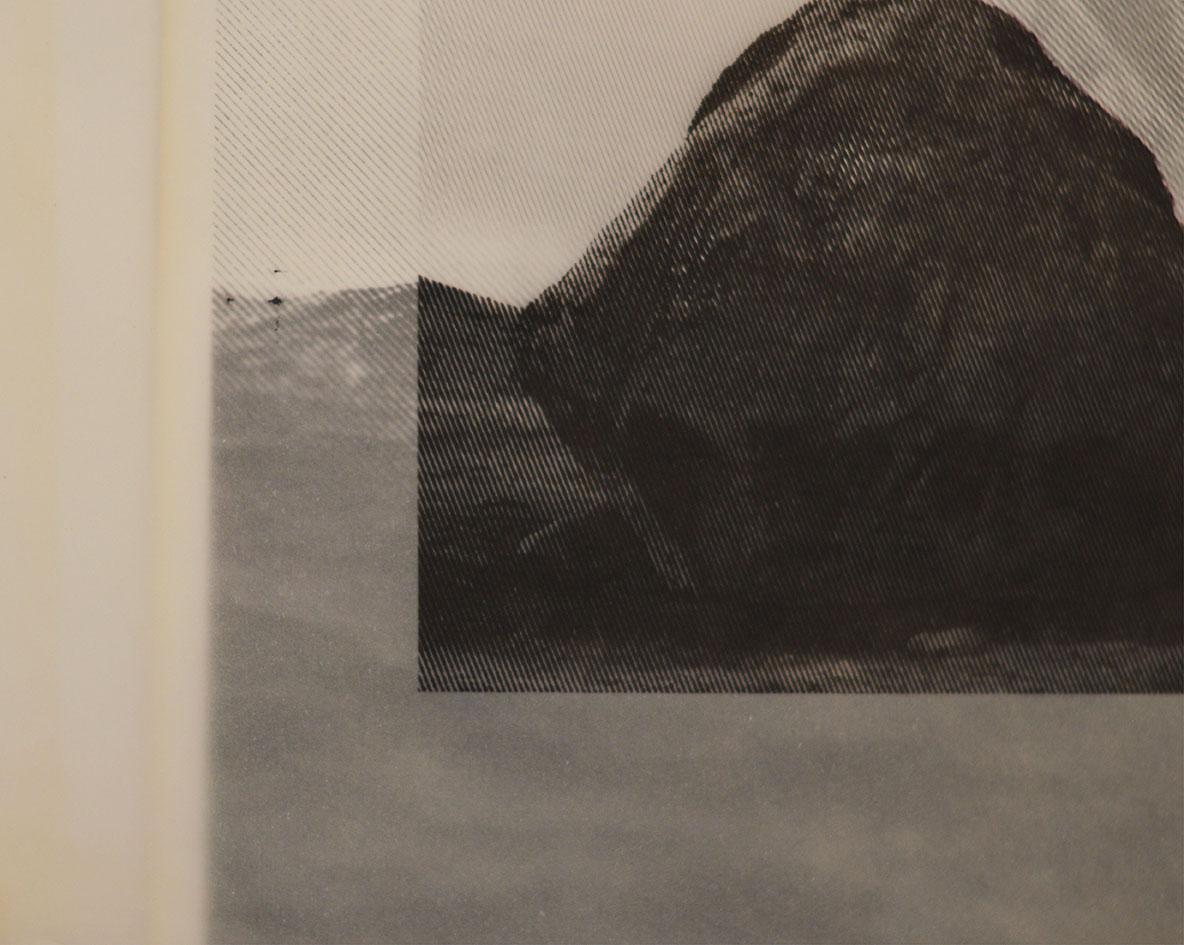 Vivant quotidiennement à la fois avec une très grande affiche de Michel François de deux grands blocs rocheux, et une bibliothèque pleine de livres des années 80, une imagerie d’aventures en terres glaciaires, l’idée d’une superposition roche / glace lui vient. La photo d’une roche granitique prise par ses soins lors d’une promenade sur le plateau de l’Aubrac et une image choisie dans un des livres de la bibliothèque, feront la paire.