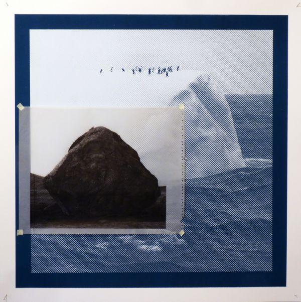 Quant à la réalisation, il y aura : - d’abord un fond bleu, dense, - l’image de glace blanche, et apposée dessus - une feuille de calque également sérigraphiée de la photographie de roche lozérienne et de son oiseau.