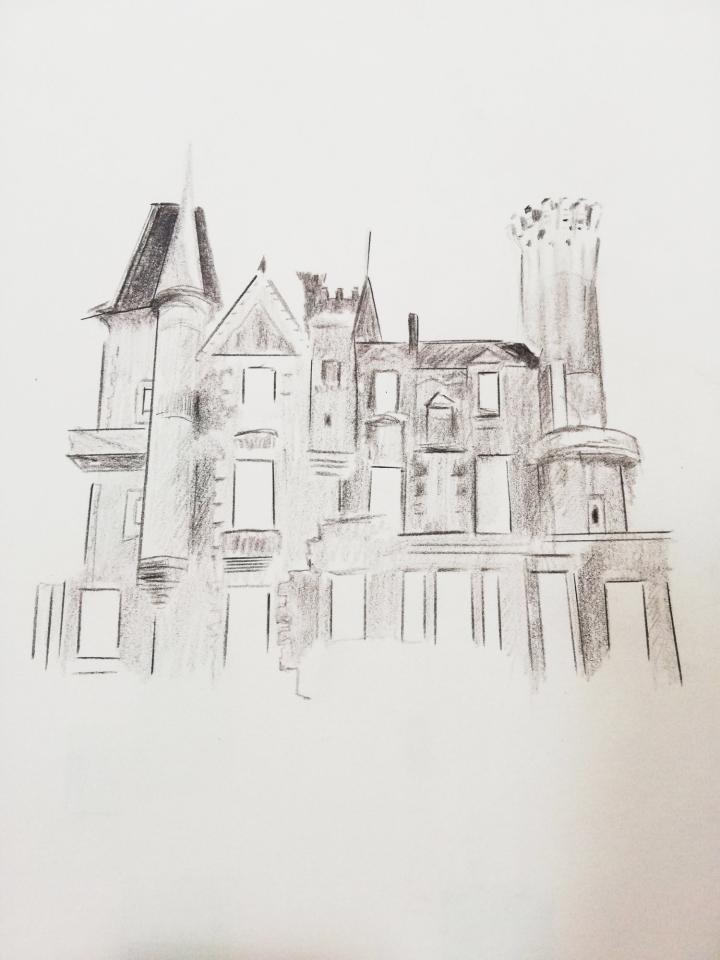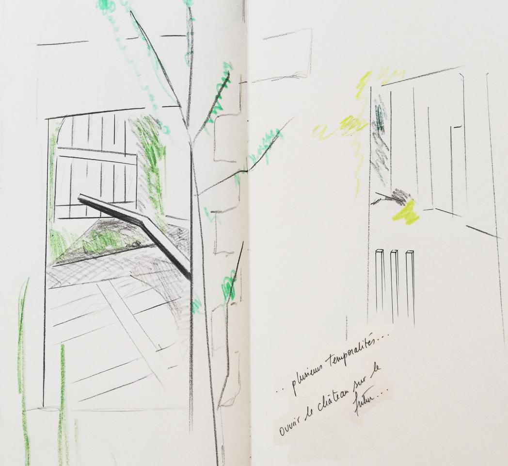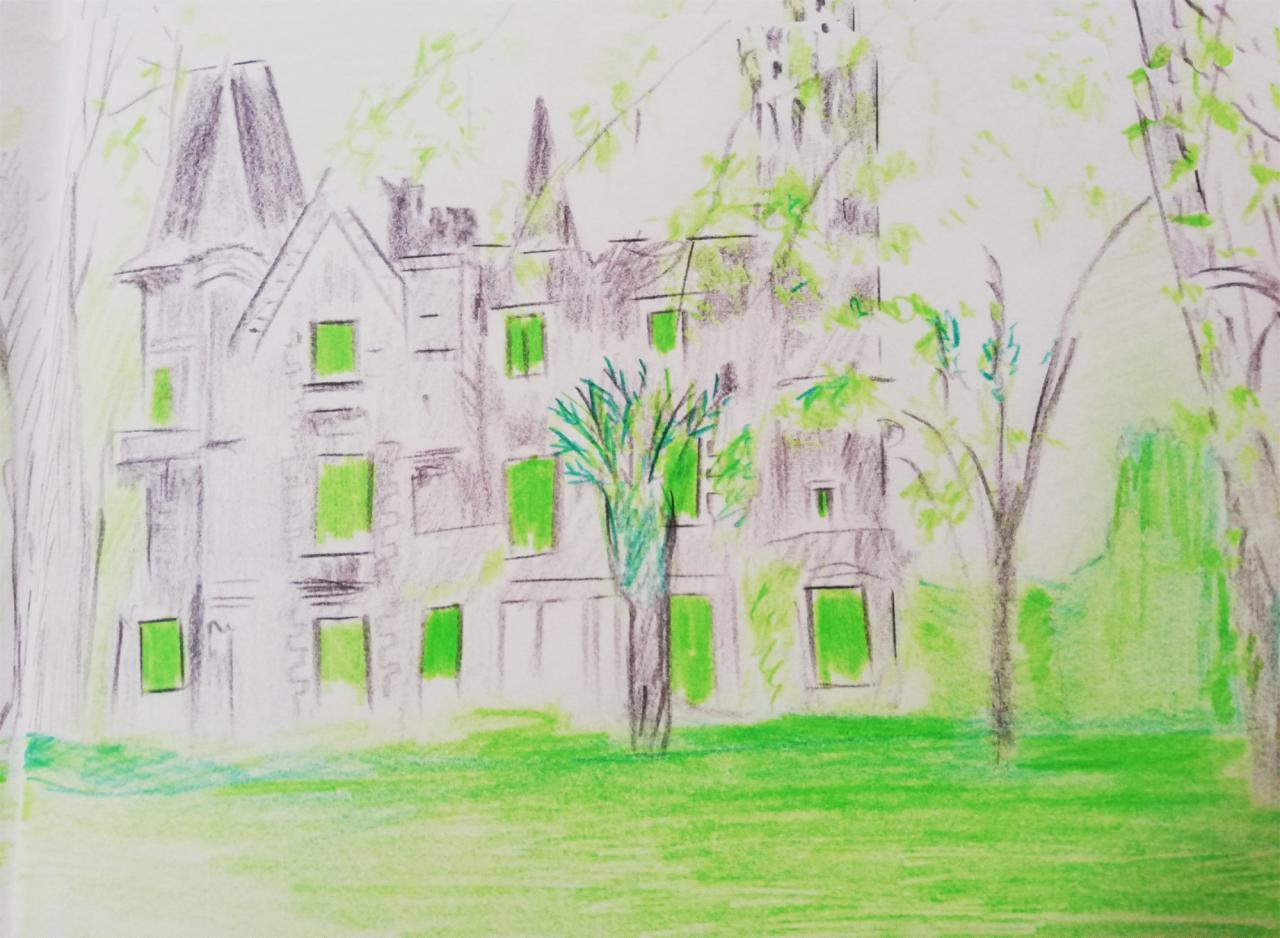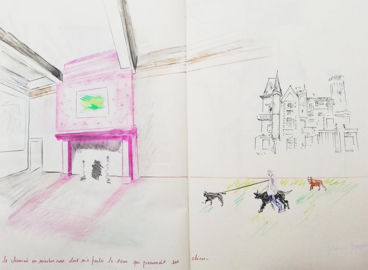 L’artiste ne s’est pas souciée de la véracité du passé, pour elle « cela se joue ailleurs ». Ainsi a-t-elle évité l’usage de documents d’archives qui peuvent s’avérer enfermants. De même, bien que ses peintures soient proches d’un réalisme photographique, elle n’a pas utilisé de vues du château tel quel, mais s’est attachée à quelques détails pour créer de nouvelles visions. Elle a également réalisé sur place toute une série de croquis qui sont à ses yeux « une mise en route du travail, une appropriation de l’espace ». […]