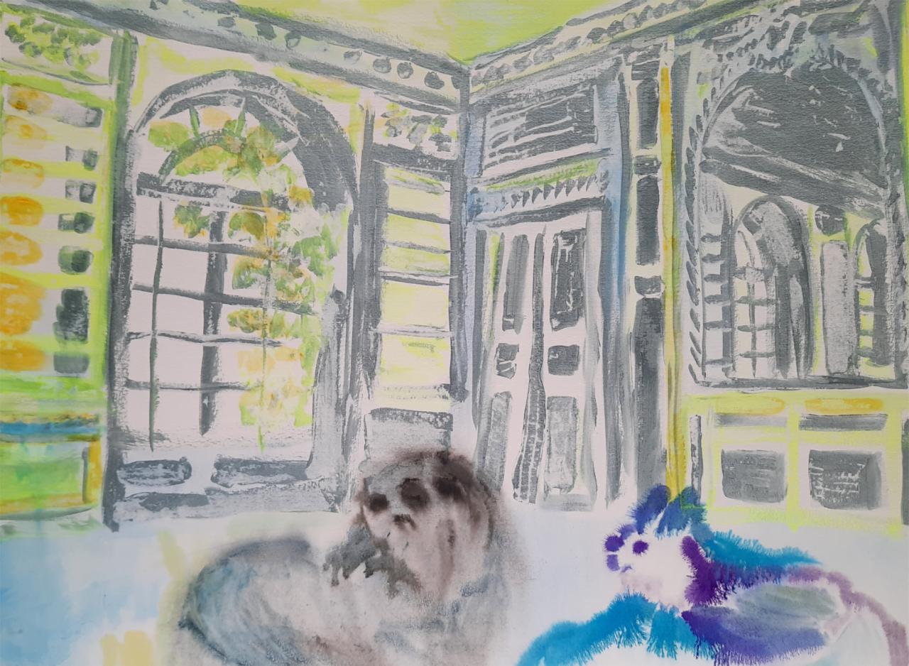 Muriel Rodolosse met en œuvre un univers hybride où l’espace et le temps fusionnent, où le foisonnement végétal dialogue avec les éléments architecturaux, où des animaux et des figures humaines énigmatiques se meuvent. Un récit s’instaure ainsi entre les peintures et leur lieu d’exposition, une immense cimaise où il est possible de mettre en scène une multitude de vues pensées comme autant de tableaux théâtralisés qui interpellent le spectateur tout au long de son parcours.
