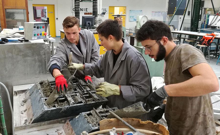 Étudiants de GCCD travaillant au remplissage des moules de Parpaing-fils