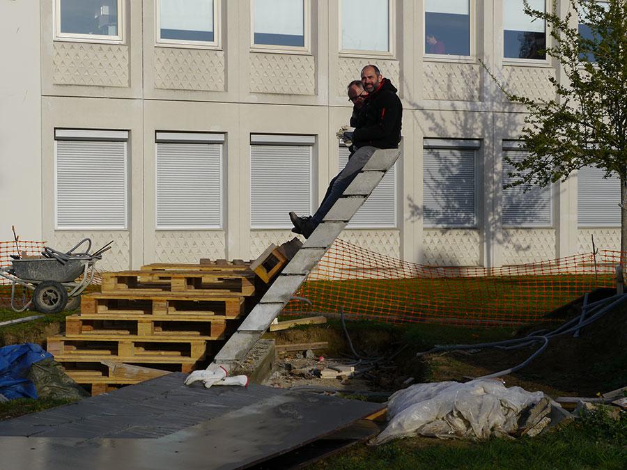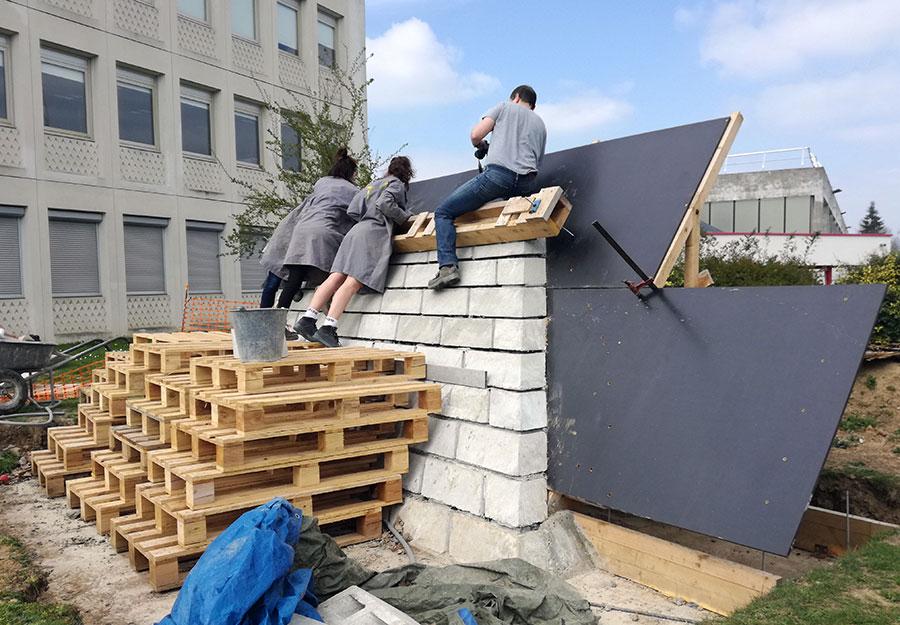 C’est le projet Parpaing-fils qui est prolongé pour la création du (Mur 127) de trois mètres de long sur deux mètres de haut incliné, qui se dresse tel un OVNI sur une pelouse de l’IUT. Pouvant être considérés comme un hommage à Claude Parent, architecte étant allé à la conquête du plan incliné, ce mur penché et le parpaing qui en est la genèse partent avant tout d’une information spécifique : celle de l’angle zéro-gravité. Cet angle à 127° par rapport au sol est la posture adoptée par les astronautes de la NASA lors de la mise à feu au décollage. Cet angle d’assise permettrait alors de supprimer les tensions de la colonne vertébrale, diminuer la pression et la gravité sur le corps. Utilisé par la NASA, il est également présent au sein de l’espace 127, la classe Affaires des avions Air France et serait la position confortable pratiquée par les adolescents. Il s’agira dès lors pour l’artiste de réaliser un mur à 127° par rapport au sol. Ainsi lorsque le mur, le sol et le corps se rencontrent, ils agissent les uns sur les autres et engendrent une modification de la perception. Des prototypes de Parpaing-fils ont d’abord été édités comme des sculptures en béton, des œuvres indépendantes numérotées et signées. La conception avec les étudiants des deux départements a pris du temps. Pour réaliser un parpaing à 37°, il fallait abandonner le parpaing français à six alvéoles et privilégier le parpaing américain à seulement deux alvéoles pyramidales. Il fallait ensuite trouver la composition finale du béton : plein, fibré et conçu à partir de ciment pour pont. Tous les jeudis après-midi, l’équipe s’est attelée à cette tâche : résolution des aspérités en surface, du souci de ségrégation, de l’homogénéité du béton. Pour la réalisation du mur, il était nécessaire de concevoir deux types de parpaings : le parpaing-fils et le demi parpaing-fils.