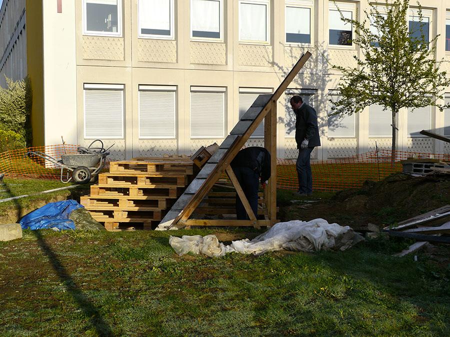 La dernière rangée de parpaings en cours de réalisation