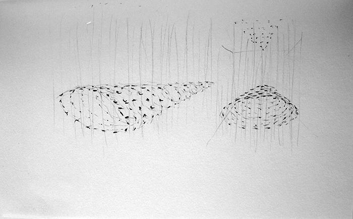 plumes de goélands, fil, cire, poudre de marbre de Carrare, 380 x 170 x 120 cm à 30 cm du sol