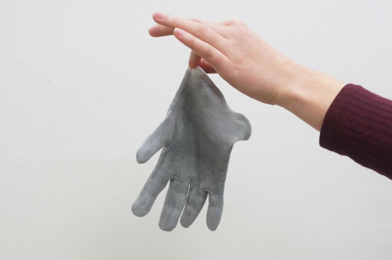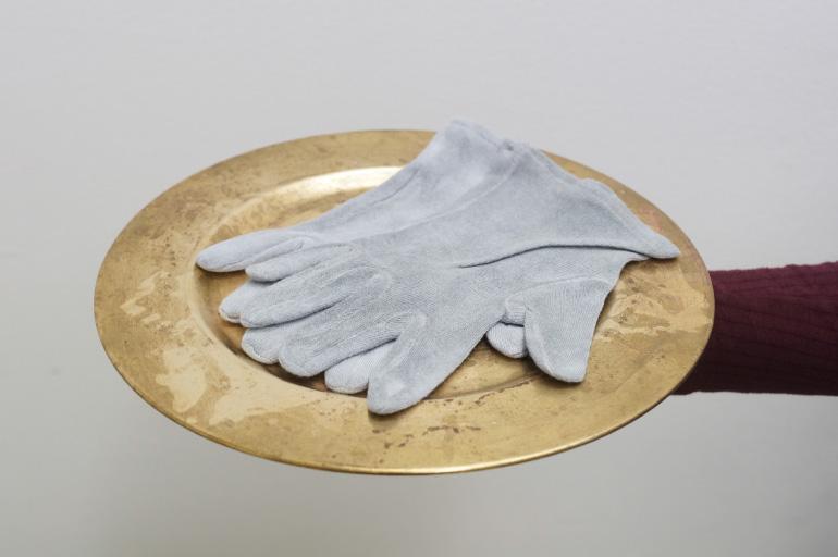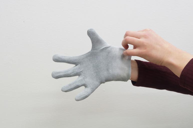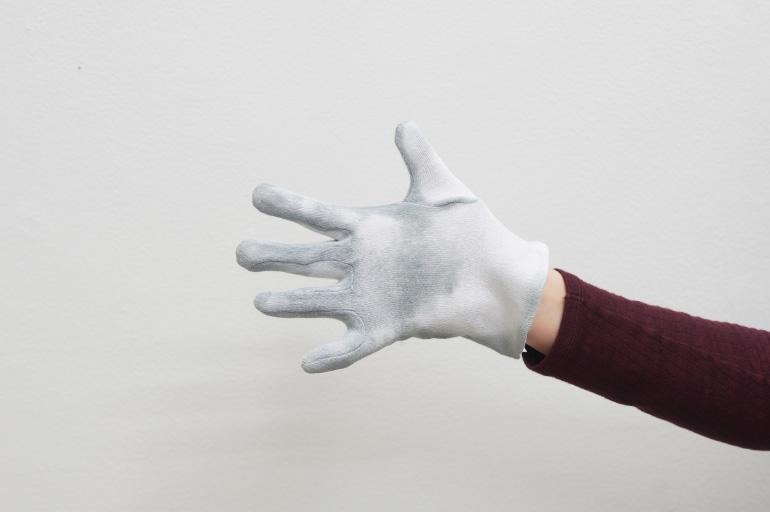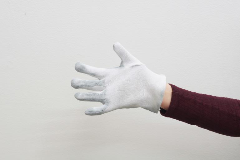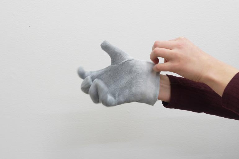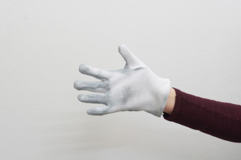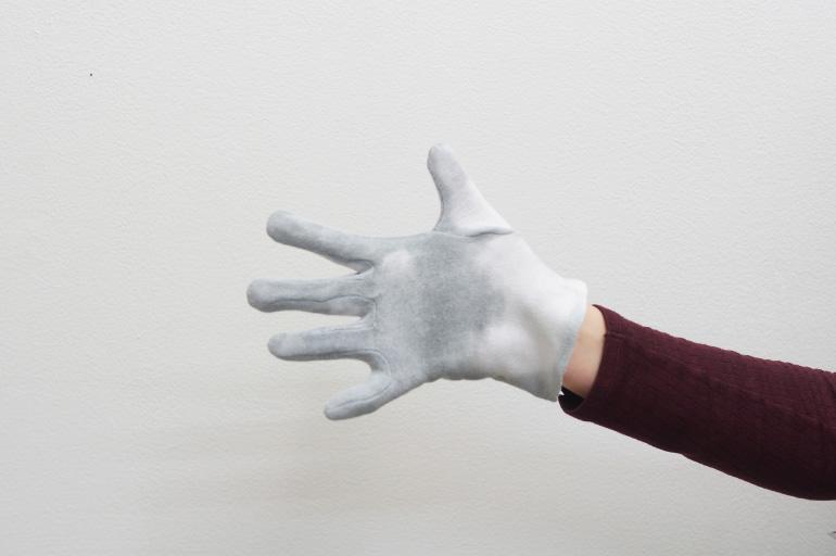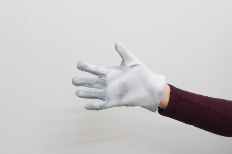 Pause (2018) prend forme à partir d'un contexte de présentation spécifique, intervenant à l’adresse des visiteurs comme un moment d’accueil. En utilisant une sorte d'inversion d'usage, Bruno Silva se sert de gants à la place des serviettes pour envelopper des sandwichs « bifanas », typiques de la culture culinaire portugaise, cuisinés et offerts par l'artiste pendant la soirée. Le gant, instrument-objet lié à de nombreux aspects de la vie quotidienne, aussi bien laborieuse que mondaine, assume ici une triple fonction : prendre la nourriture, marquer un geste et créer une chorégraphie picturale vivante. Les couleurs de la nourriture et celles, plus incertaines, de la peinture thermochromique sur les gants, émergent pendant la dégustation du sandwich. Bruno Silva recourt de nouveau à « l’effet » de la peinture thermochromique 6, à la fois en tant que maquillage et comme artifice, qui blanchie avec la température du produit et du corps. Le gant devient ainsi une surface sensible dotée de la capacité de réagir et d'absorber, la rencontre entre le processus physique et l'évènement social marquant une zone d'intérêt. Et le résultat est semblable à un « table(au) vivant » posthume du banquet offert 7, dans lequel l'artiste est flâneur, partie prenante parmi d'autres types d'utilisateurs d'un « territoire circulatoire » 8 de temporalité sociale. D'ailleurs, Bruno Silva s’active à la recherche d'une « symbolisation rituelle » de la relation entre l'homme et son écosystème, accentuant la puissance des symboles emmagasinés dans la mémoire d'une culture plus globale.