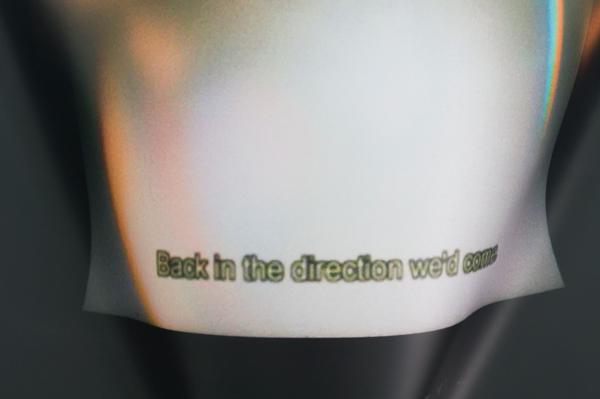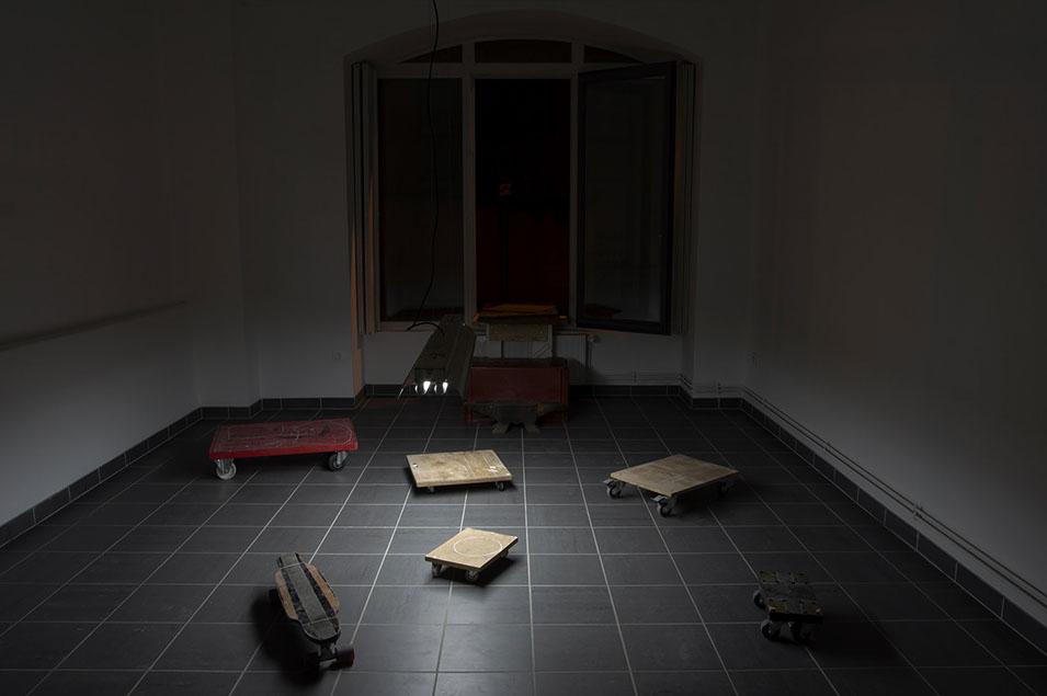 4 Couac, supports roulants appartenant à Hervé Bréhier, vue de l’exposition Couac Couac, atelier d’Hervé Bréhier, Clermont-Ferrand, 2016 ; Back the way I’ve come, impression sur bâche, dimensions variables, 2016