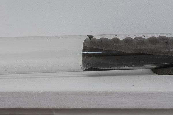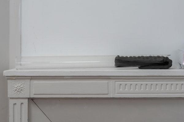 3 Éponges, tube en verre, serpillière, résine cristal, 2017 ; Diving into the water flux with strangers, verre noir transparent, bâche en plastique transparent, dimensions variables, 2016