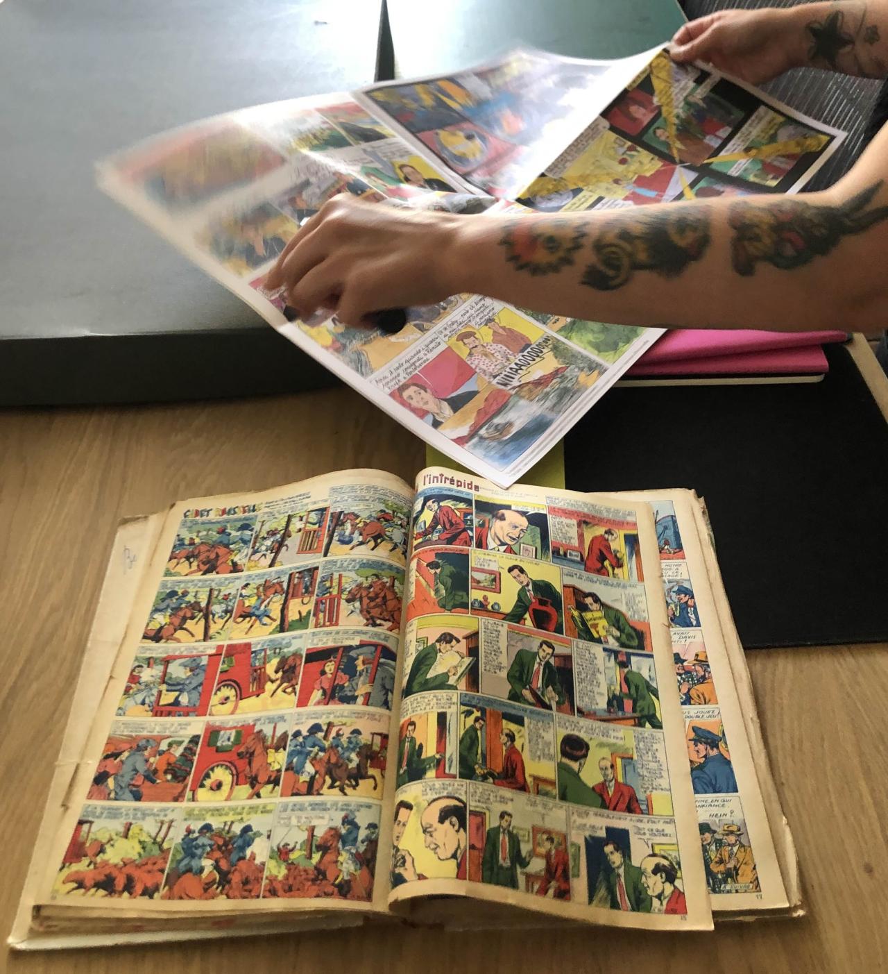 Camille Lavaud Benito, Le Mystère Cézanne. L’ombre du doute, Rencontres du 9e art, Aix-en-Provence, 2025 à côté de « Guy l'Intrépide » de A. M. Capella et Roger Burty qui paraît dans un numéro de L’Intrépide des années 1950. Eymet, 25 août 2025. © droits réservés