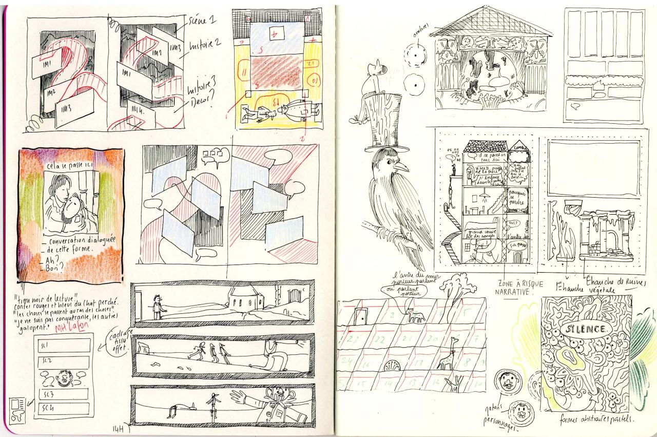 Compulsant des documents oubliés dans des archives choisies et chéries, qu’elles soient intimes et familiales, ou consacrées à des inconnu·es8, lisant aussi toutes les ressources contemporaines disponibles, Camille Lavaud Benito mène des enquêtes minutieuses et érudites qui la rapprochent de l’historien, du chercheur, de l’enquêteur9. Elle y découvre des parcours cachés, des connexions oubliées et inédites. De cette recherche tout à la fois laborieuse et jouissive, elle tire des « récits multiples, construits simultanément, et qui se répondent, tels des vases communicants10. » Ils se rejoignent dans des galeries de personnages et des parcours de vie, associés à des lieux, à une géographie, figurées dans des cahiers de notes luxuriants. Toujours touffues, ses histoires – ses exofictions – tissent de singulières épaisseurs du dessous, s’ancrant en de savantes racines. C’est cette « vie souterraine » qui l’anime, dans toutes les arborescences de ses récits, au point qu’elle a donné ce nom à un projet de film, en 201711, et à sa première bande dessinée, publiée par les Requins Marteaux en 2021 (Fauve Révélation au festival d’Angoulême en 2022). Elle en dessine la suite aujourd’hui ; ce sera Les Silencieux, publié en septembre 2026.