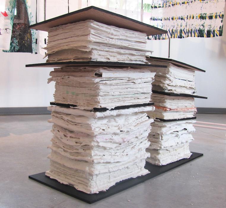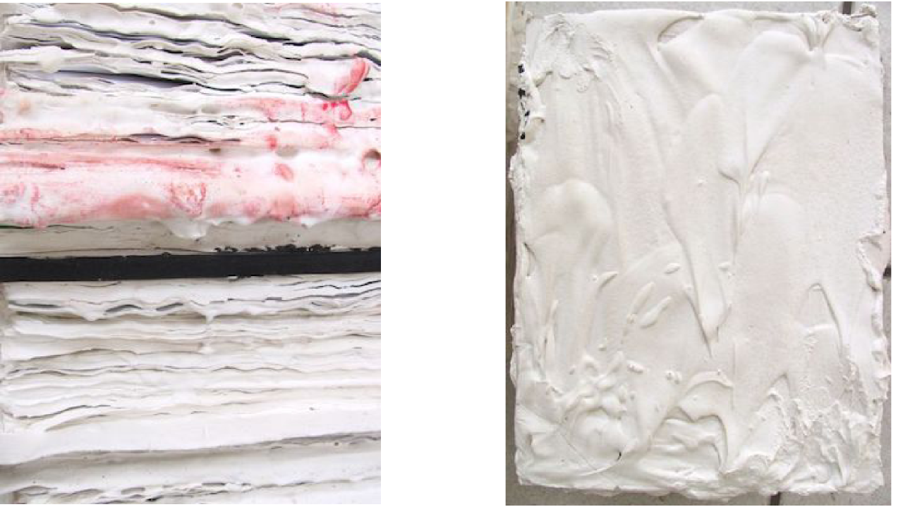 Christiane Fath arrange et assemble ces tissus en leur conférant une dimension sacrée – comme dans un rituel profane et cathartique ; elle les trempe par la suite dans une fine couche uniforme de plâtre blanc, qui n’est pas sans rappeler les laits de plâtre qu’utilisait Rodin, si on pense notamment à la robe de chambre qu’il a réalisée en préparation du Balzac. La peinture devient ici un liant sculptural qui génère une masse blanche et informe. En opérant de la sorte, elle annihile la fonction première de ces objets et les recontextualise dans un nouvel environnement formel. Entre peinture et sculpture, Le Meuble à Rideau (2009), par exemple, est une véritable concrétion de temps : les notes et autres documents de travail de la vie professionnelle de l’artiste sont empilés par couches, plâtrés et colorés par de légères traces de peinture, tel un pied de nez à une vie imposée et ordonnée par les méandres parfois kafkaïens de l’administration.