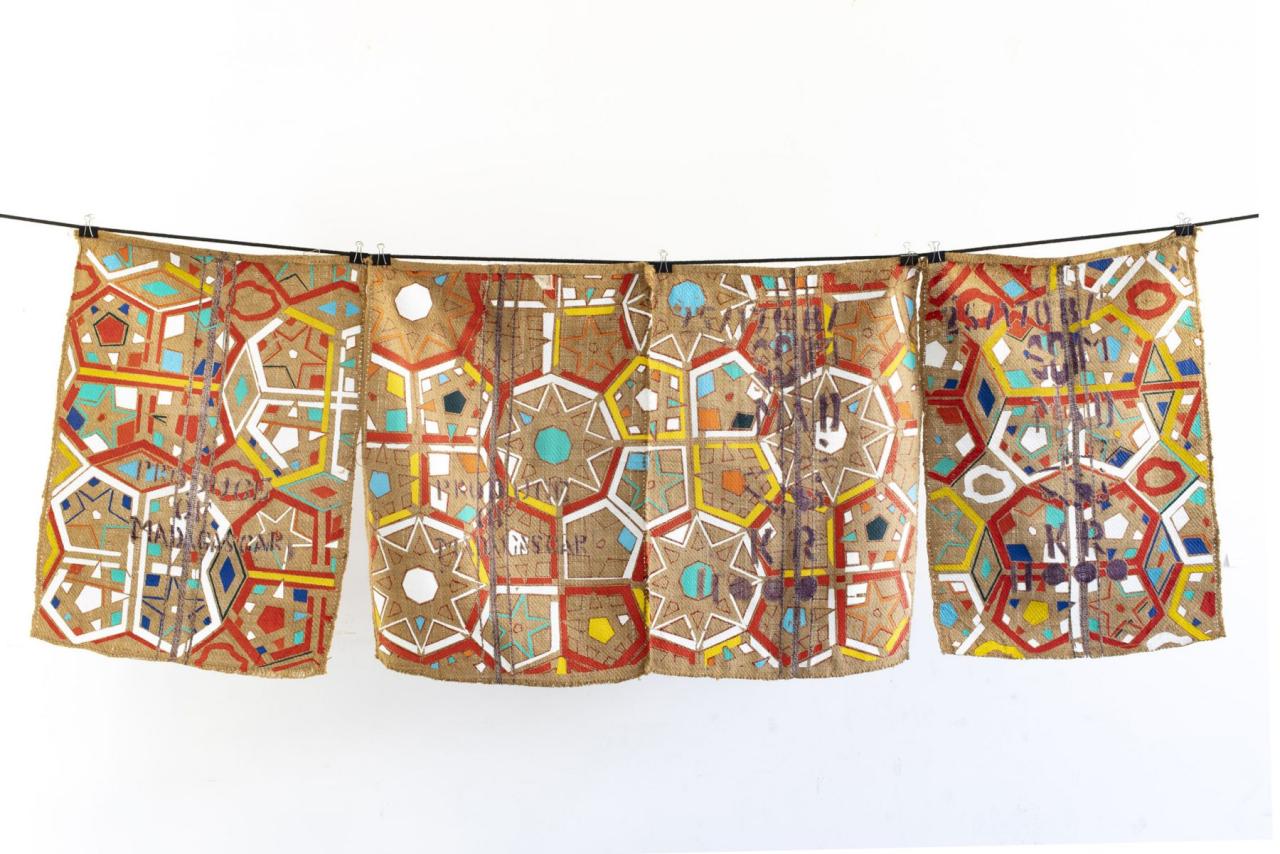 En outre, le choix du support textile est éminemment précis dans la démarche de Christiane Fath. Il s’agit en partie de tissus qu’elle a récupérés, à l’instar de sacs de café issus des marchés malgaches de Mahajanga ou de draps et autres nappes provenant de malles familiales. Chacun de ces supports est marqué par une histoire, un artisanat, un contexte géographique et économique. Qu’il s’agisse de la série des Toiles mosaïques (2012-2015) ou des Routes (2018), les couleurs les plus vives alternent très souvent avec le ton plus sombre et la surface rugueuse de la toile de jute ou les légers reliefs piqués du damassé. Au-delà de cet aspect purement pictural, le tissu permet à Christiane Fath de proposer une autre compréhension de ces étoffes comme réels marqueurs d’une identité mêlée, intrinsèquement liée au colonialisme et au commerce entre l’Europe, l’Afrique et l’Asie dans la seconde moitié du XIXe siècle. Ainsi, quand ses interventions picturales s’entremêlent à la répétition sérielle des motifs des indiennes de Provence, l’artiste révèle une dynamique de syncrétisme à la fois formel et culturel, renvoyant à une sédimentation historique où les Indes rencontrent le sud de la France et le pourtour méditerranéen.