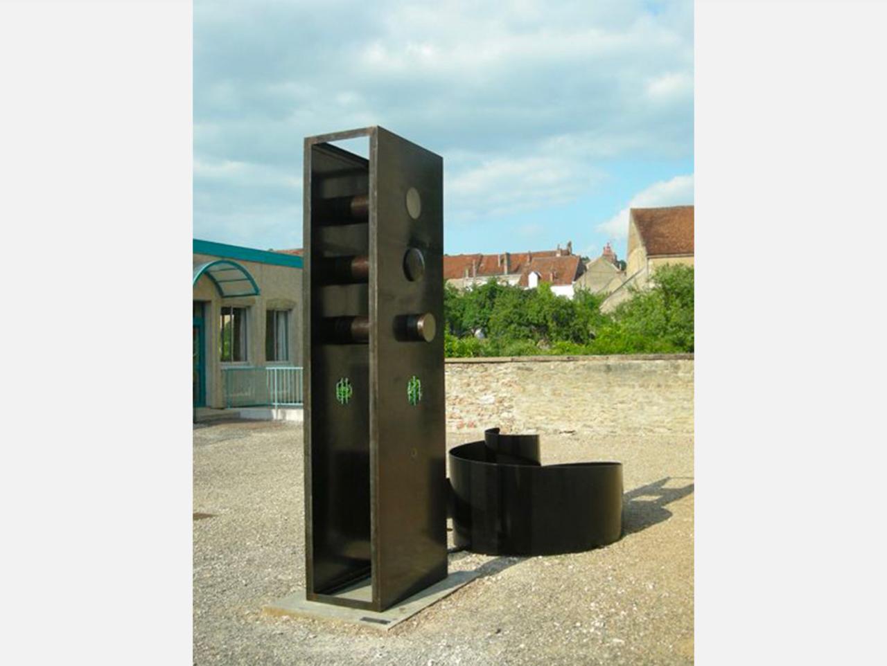 3. 06 15 2010 47° 21' 38N 3° 23' 6E, 2010. Sculpture conçue, réalisée et installée de façon pérenne pendant la résidence avec les élèves de ferronnerie du Lycée professionnel – Collège Mont Châtelet de Varzy (Pierre Cluzel, Sylvain Dechaume, Nicolas Deléchenault, Dimitri Dieudonné, Clément Fouley, Camille Freret, Jonathan Heurgué, Xavier Karger, Émilie Kowalscyk, Kenny Lofel, Cyr-José Meira, Brice Minana, Quentin Morisset, Clément Tartar).