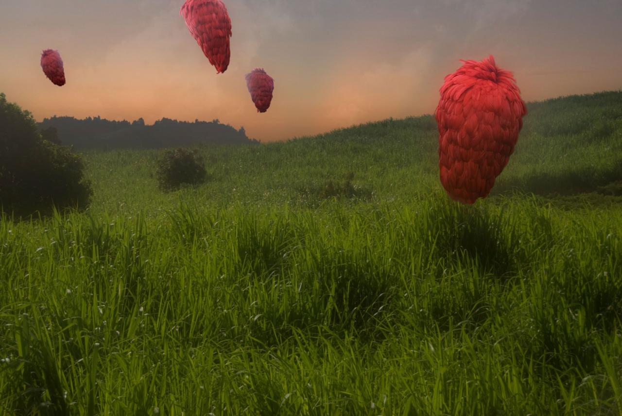 Pour Esther Hoareau, la science-fiction et le fantastique deviennent de puissants outils de contradiction, et une façon de réfuter ou de détourner une vision imposée. Les paysages photographiques et cinématographiques que crée l’artiste sont souvent dépourvus d’humains, mais néanmoins remplis de forces vitales. Ses œuvres évoquent des décors à la fois familiers et surnaturels, dont les seuls occupants sont une paire d’énormes ballons gonflables qui rebondissent et flottent au gré du vent (Hidden Beings, 2018), ou sont attirés dans leurs orbites respectives à la surface de l’océan (Eclipse, 2017). Ailleurs, des émissaires venus d’un autre monde, couverts de plumes et en forme de pommes de pin, descendent sur terre (Ovni, 2013) sans que l’on connaisse leurs intentions.