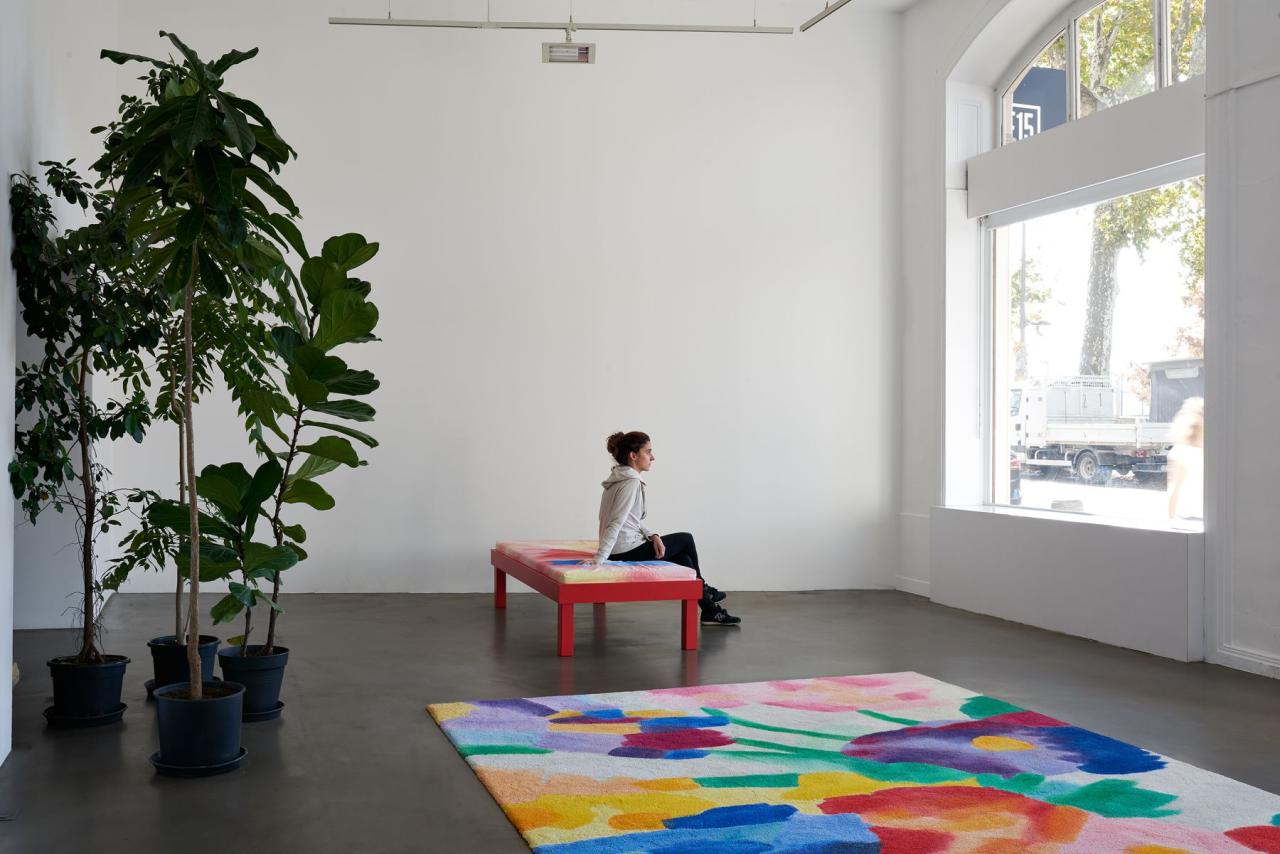 Ce matin-là, on attend de savoir qui sera notre Premier·ère ministre. Après avoir bu plusieurs cafés, accompagnés de discussions informelles pour updater nos vies respectives entre les gouttes de pluie qui tombent sur la petite terrasse en bois, nous décidons d’aller faire des courses au marché. Cette activité se place au-delà de notre envie de travailler ensemble, car nous avions précédemment évoqué notre envie de partager des repas, ce qui nous semblait être une forme de travail en soi. Pour cette même raison, j’ai fait le choix de rester dormir dans son appartement, nous permettant de partager des moments du quotidien : travailler dans les marges. Nous avons traversé la ville à vélo, discuté avec des commerçant·es, arrangé un bouquet de fleurs composé de quelques brindilles aux fleurs violettes, de deux hortensias roses, de petites fleurs blanches et jaunes et de branches d’eucalyptus, une bonne technique pour créer des bouquets à moindre coût. En regardant le fleuriste préparer notre arrangement, nous réalisons que nous avons toutes deux une obsession pour les hortensias (elle pour leurs couleurs et moi, parce qu’elles sont belles, même lorsqu’elles fanent). Eva me parle des changements de couleur des hortensias, influencés par le changement de pH de la terre : les pétales peuvent ainsi passer du bleu au rose et au violet. Quelques heures plus tard, dans l’atelier, Eva me confie que les fleurs, qu’elles soient fraîches ou fanées, ont une présence particulière dans son quotidien : elles influent sur sa manière de vivre avec les couleurs, de les regarder changer et de les convoquer. Eva me raconte son expérience au musée des Beaux-Arts de Lyon, lorsqu’elle découvre le Salon des Fleurs, une section dédiée aux peintures de fleurs : des exercices techniques réalisés au XVIIe siècle par des peintres à partir de bouquets de fleurs, cueillis chaque matin et déposés dans une salle d’étude de l’école des Beaux-Arts, pour réaliser des motifs floraux à des fins de production de pans de soie par les tisserand·es. À la manière de ces peintres, Eva réalise des peintures de fleurs sur des tapis et des housses en tissu. Sous ses coups de pinceau, les motifs floraux deviennent des abstractions, qui se font absorber dans les fils de coton. L’exposition Make Yourself Comfortable 1 proposait aux visiteur·euses de prendre un temps de repos et de s’installer confortablement sur des banquettes peintes, disposées face à la fenêtre qui donne sur la rue, afin d’observer le spectacle de la ville : les passant·es qui se croisent sur le trottoir, la colline de Fourvière, immobile, elle, pour l’éternité, deviennent le sujet central de l’exposition. L’expérience de l’œuvre est inversée, retournée sur elle-même, et les spectateur·rices expérimentent l’exercice du regard depuis le point de vue des œuvres.
