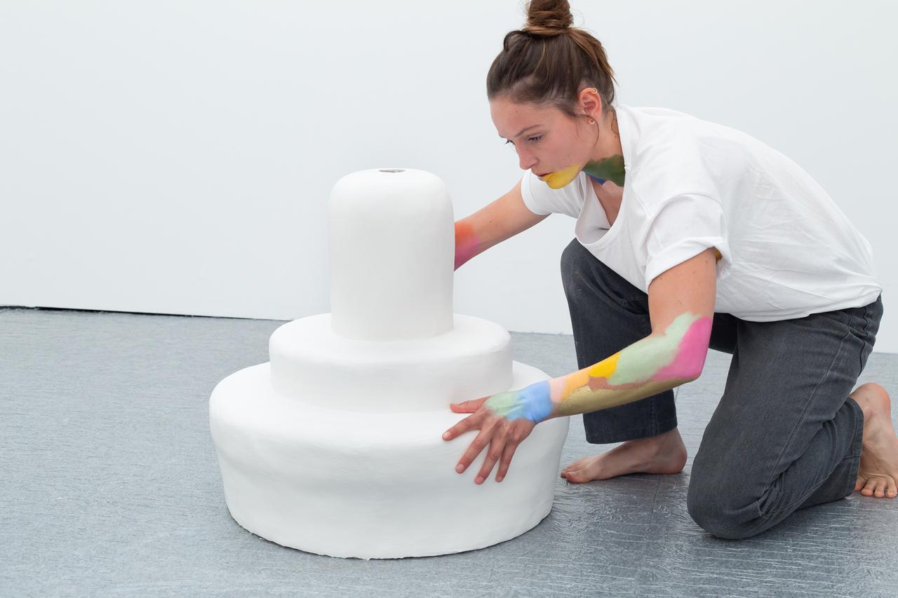 Pareilles à des énigmes, les expositions d’Eva sont nourries et composées de versions en attente, qui offrent aux visiteur·euses la possibilité d’accéder à la pensée de l’exposition et ses hypothèses. Accompagnée de collaborateur·rices et complices 4 , Eva écrit les scénarios de l’exposition Ni dans les rouges-gorges ni dans les bisons 5 . À la manière d’une troupe de théâtre, iels écrivent une chorégraphie dans laquelle les sculptures deviennent les actrices, dirigées par des voix qui dictent la diversité de leurs mouvements. Dans l’épaisseur de ces paroles, la possibilité d’une autre rencontre entre les formes, l’espace, le temps et les couleurs. Alors que ces mots archivés résonnent sous des parasols colorés déployés, les spectateur·rices observent la documentation des corps-palettes qui manipulent ces sculptures blanches, immaculées, sans qu’aucune couleur ne les tache, autrement que celle des radiations de notre imagination. Ces présences fantomatiques rôdent en coulisse, entre les câbles électriques et les caméras, pris sur le fait de la manipulation par l’acte photographique. Ces corps en action deviennent les doublures des personnages-sculptures qui dansent leurs multiples apparitions.