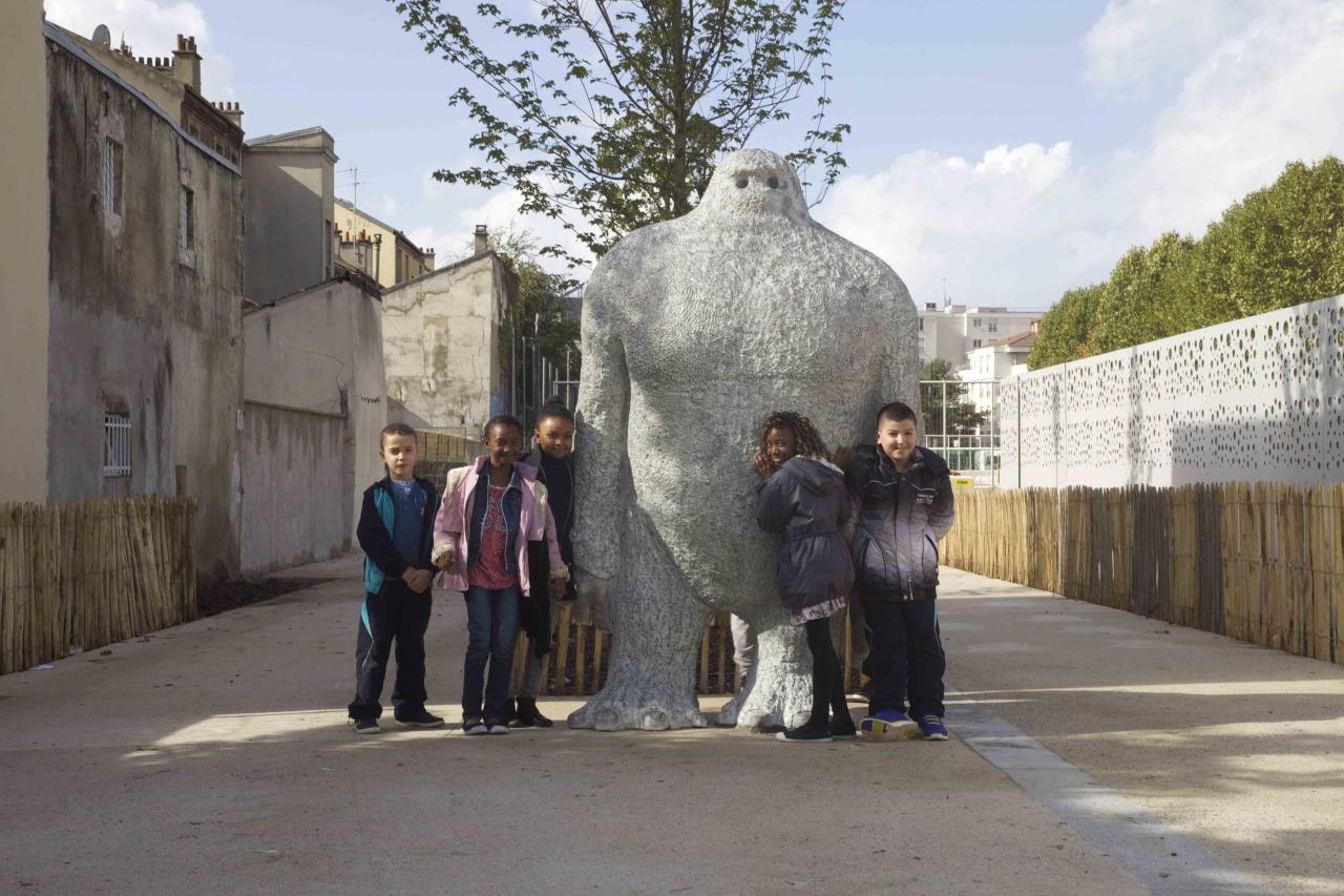 Du reste, l’une des réalisations les plus emblématiques, un yéti hirsute de plusieurs mètres de haut (à taille réelle donc, dans la mesure où le domaine de réalité d’un yéti n’a de plan qu’imaginaire) planté dans la cour d’une école et y veillant d’un sourire béat sur la marmaille en plein jeu – ce yéti prend pour titre L’Autre.