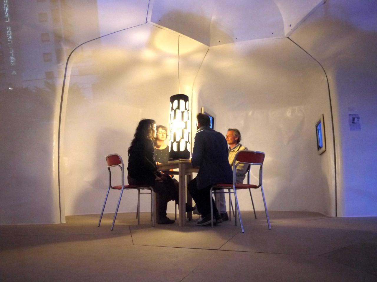 Pour redonner vie à ce voyage terrestre né d’un architecte révolutionnaire, Ibai Hernandorena propose d’y activer la Dreamachine de Brion Gysin : autour de la table en formica, le halo de lumière blanche tourbillonnante aspire les âmes pour un voyage astral psychédélique.