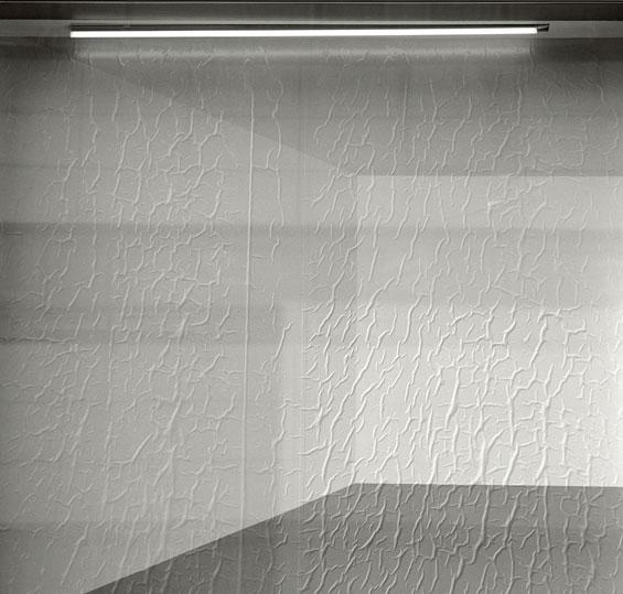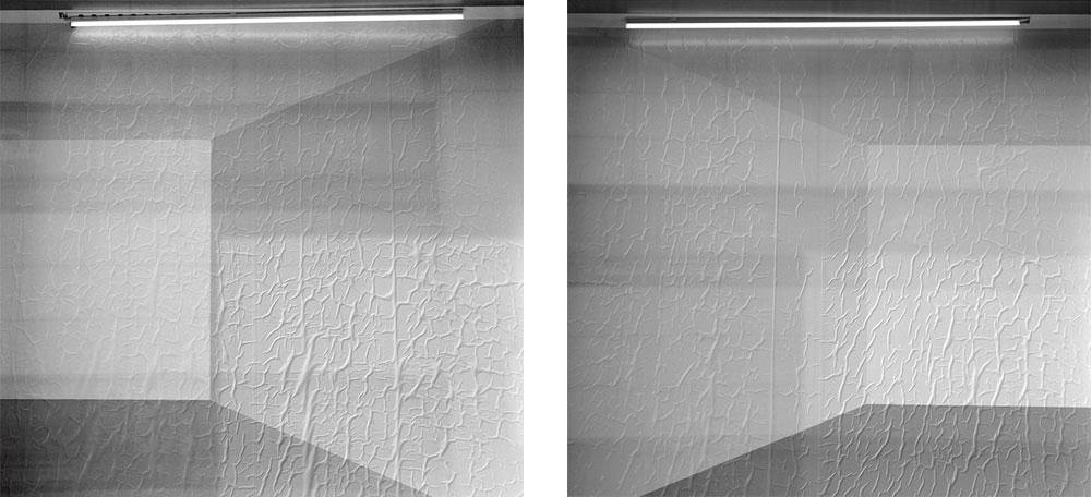 La représentation du travail de Pascal Poulain sur le site de Documents d’artistes regroupe ce qu’il appelle « des corpus de photographies ». Dans celui intitulé « Geography Expert History Freak », il y a Cube, un diptyque de 2017 qui présente deux points de vue sur l’intérieur d’une salle vide. Ce pourrait être la photographie d’un espace d’exposition, mais tout permet d’en douter : d’une part la nature graphique de cette image relève plus du dessin ou d’une représentation d’un espace, et d’autre part, la multitude de bulles d’air qui animent la surface permet d’identifier qu’il s’agit d’un mur sur lequel a été collée une affiche représentant un espace vide en trois dimensions. Ce diptyque nécessite un déchiffrement plus poussé car les deux néons que l’on identifie au départ comme fixés au plafond ne font pas partie de la surface du poster : aucune bulle d’air ne s’est formée dessus, ils sont dans un autre espace, décollés du mur et éclairent le poster gondolé. Un décryptage un peu plus poussé encore permet de comprendre qu’il y a vraisemblablement une vitre devant le poster car des ombres animent la surface du diptyque, des reflets venant de l’espace situé derrière celui qui a pris la photo. Il existe une photographie de Cube installé dans un espace d’exposition – Pascal Poulain prend régulièrement ce type de vues d’expositions pour montrer la mise en espace de ses images. Et en l’occurrence, le diptyque se trouve devant deux néons dans un espace d’exposition. Le regardeur est ainsi dans une position quasi symétrique à celle du photographe lorsqu’il a appuyé sur le déclencheur.